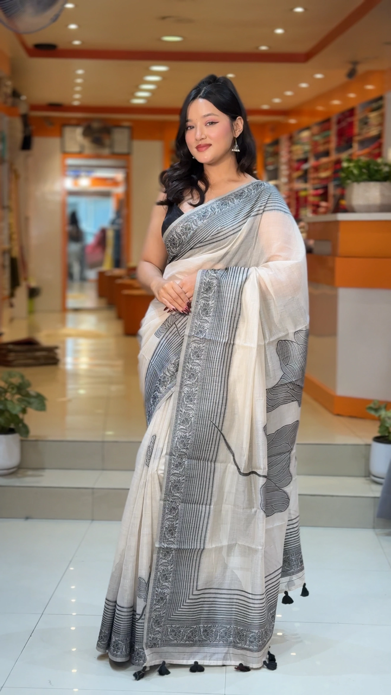 This image beautifully captures a woman radiating timeless charm in an exquisite black-toned premium linen saree adorned with subtle woven detailing and elegant borders. Crafted from high-quality linen, it offers a soft texture, graceful drape, and breathable comfort — perfect for both festive gatherings and refined everyday wear.