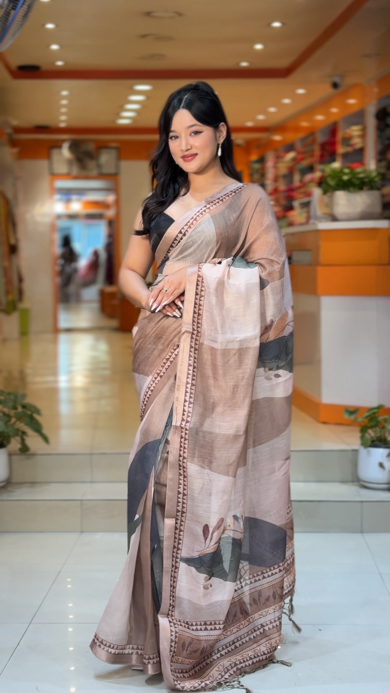 This beautifully crafted linen saree captures a perfect blend of subtle sophistication and artistic charm. Made from premium-quality linen, the fabric offers a soft, breathable, and lightweight feel—ideal for warm days, casual outings, and elegant daytime events. Its natural texture drapes effortlessly, giving the wearer a refined yet comfortably relaxed silhouette.