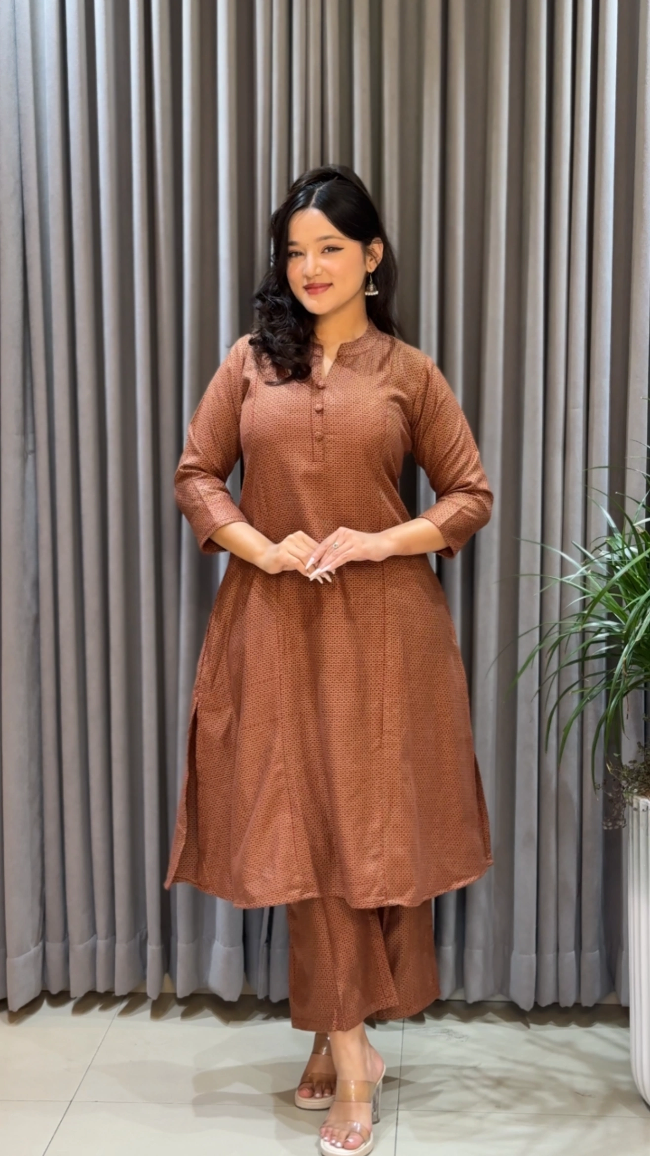The kurta features an elegant A-line cut that flares gently from the waist, creating a flattering, feminine silhouette that skims over the hips and flows to the mid-calf. It is paired with matching plazo pants—wide-legged and softly tapered at the ankle—for a chic, relaxed fit that balances structure and ease. The entire set is rendered in a sophisticated brown base, subtly woven with iridescent flecks of blue, rose, and gold, giving it a quiet shimmer that catches the light with every step.