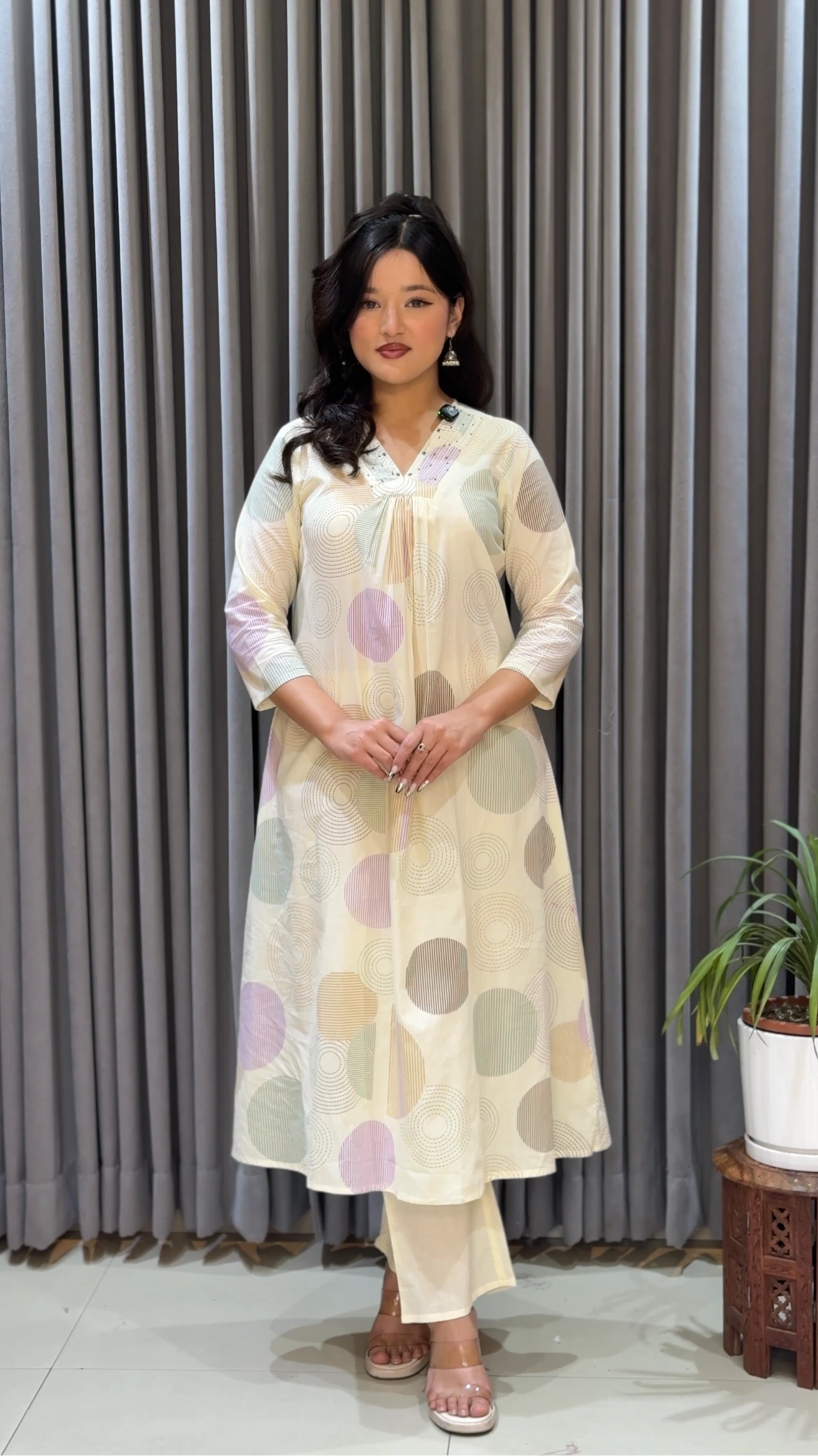 Elevate your everyday elegance with the A Pure Cotton Co-ords Set by Shreevastralaya – proudly Made in Nepal. Designed with soft pastel tones and artistic circular prints, this kurthi set brings a perfect blend of comfort and modern ethnic charm.