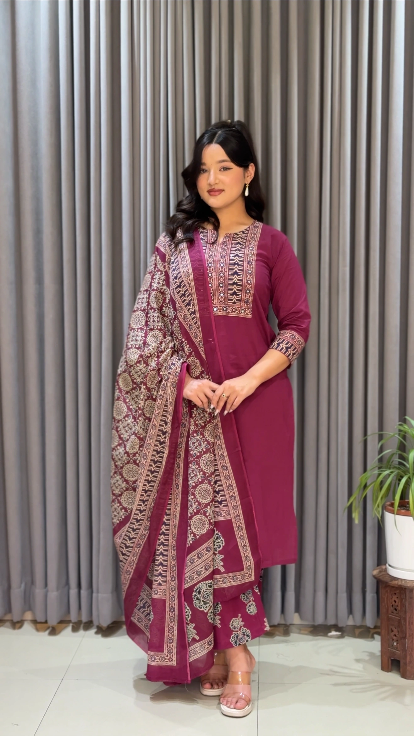 Add a touch of vibrant elegance to your wardrobe with the Blush Purple Kalamkari Elegance Kurthi Set by Shreevastralaya, a Nepal-based brand celebrating timeless craftsmanship. Designed in a beautiful pink and purple combination, this kurthi set showcases intricate ethnic patterns on the neckline and sleeves, blending tradition with modern charm.