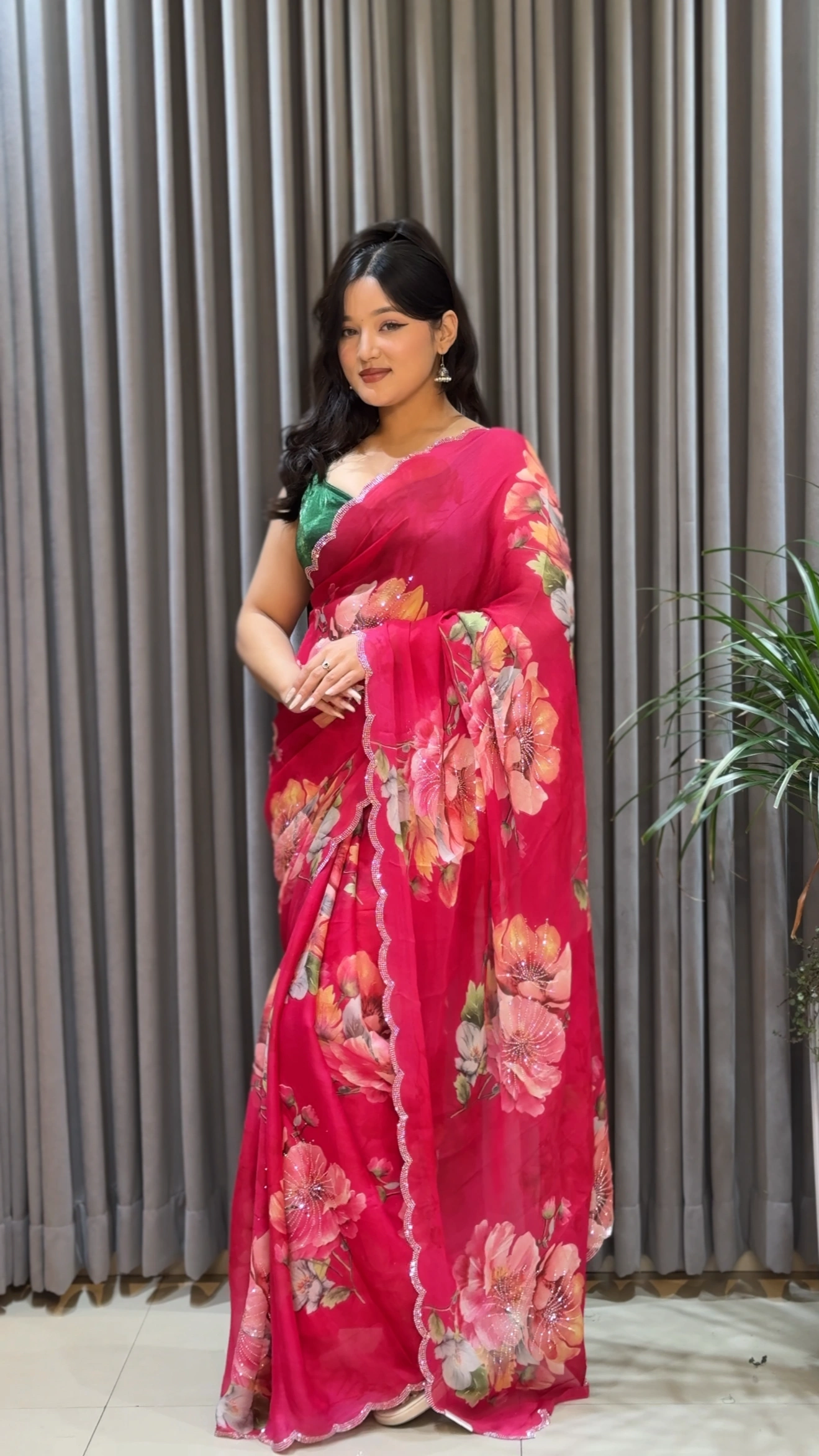 With its graceful fall, vivid floral artistry, and delicate silver edging, this saree is a stylish choice for creating standout yet easy-to-wear festive looks.