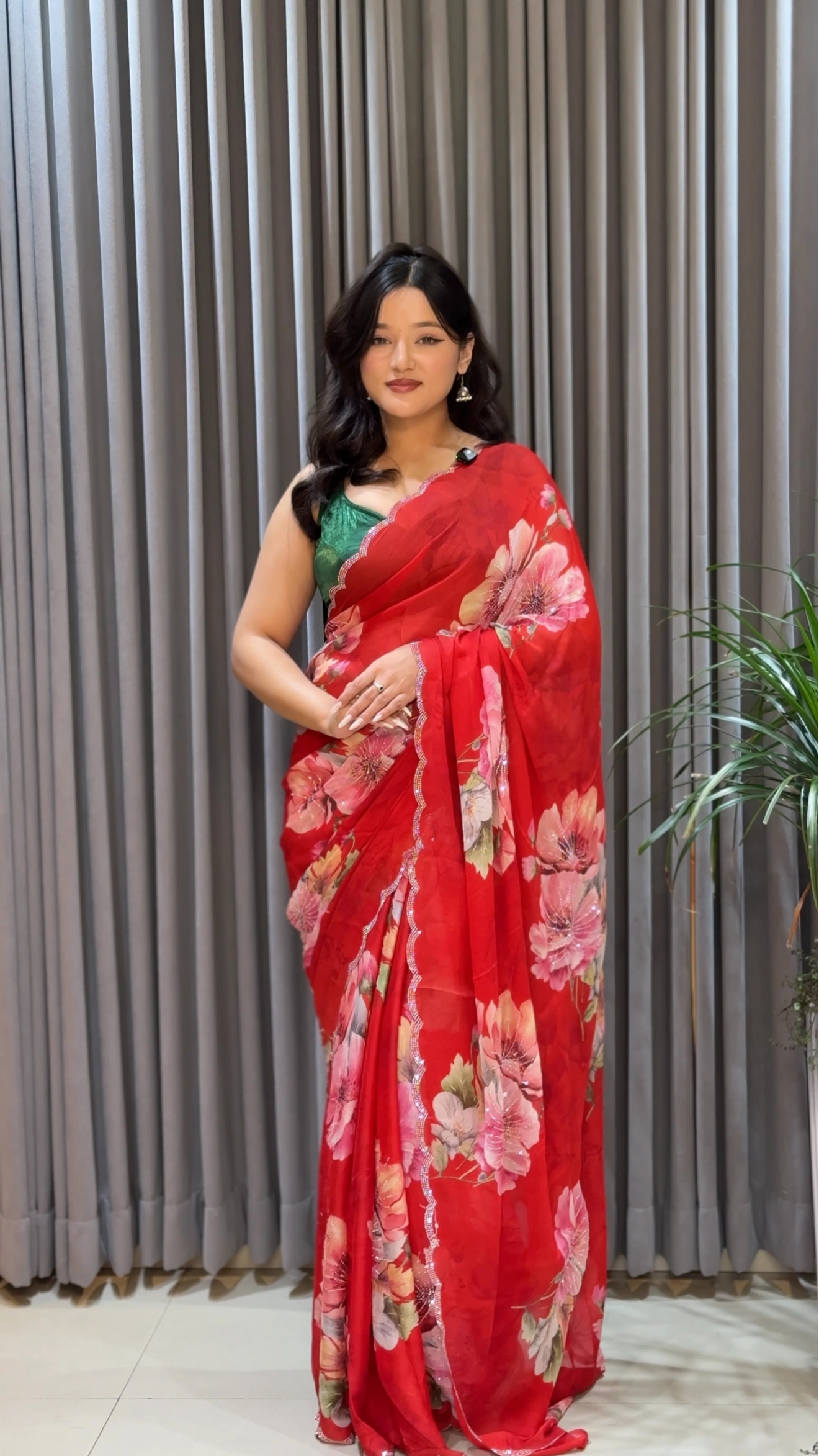 The saree features a lively and vibrant red base adorned with bold, blooming floral prints that add a refreshing burst of color. The large, artistic floral motifs create a striking visual appeal, making it both eye-catching and feminine. Its shimmering silver border adds a touch of refined glamour, offering the perfect balance between subtle shine and modern design. The overall look is chic, vibrant, and ideal for women who love contemporary ethnic fashion.