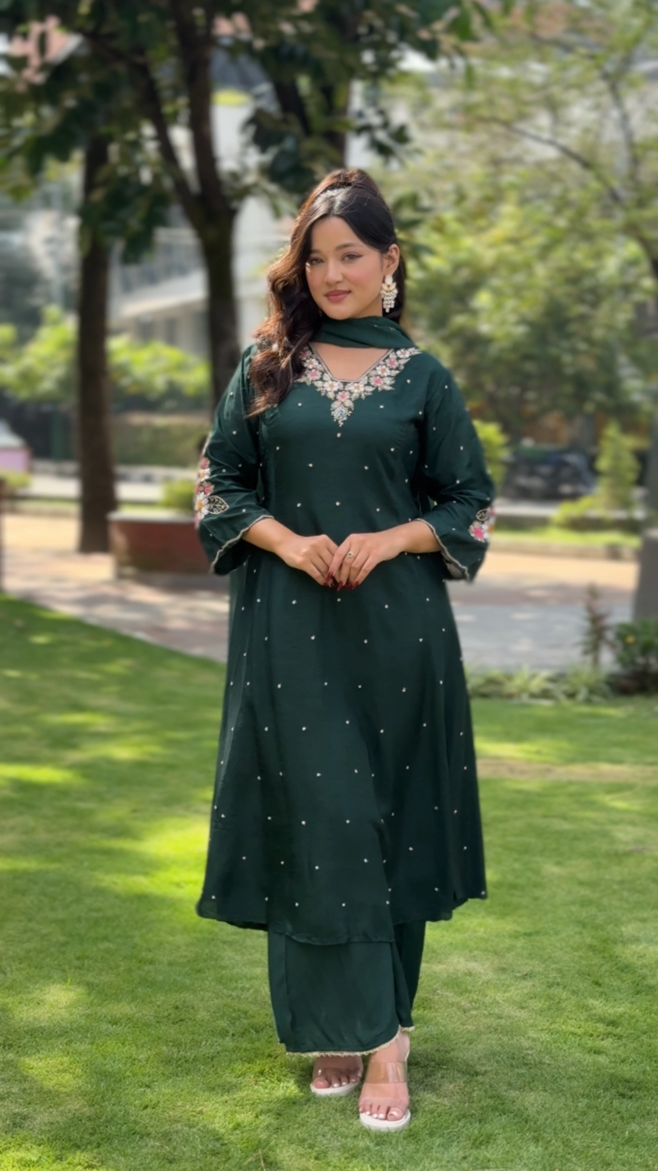 Step into timeless elegance with the Emerald Charm – Raw Silk Handwork Set. Crafted from rich raw silk, this ensemble features: