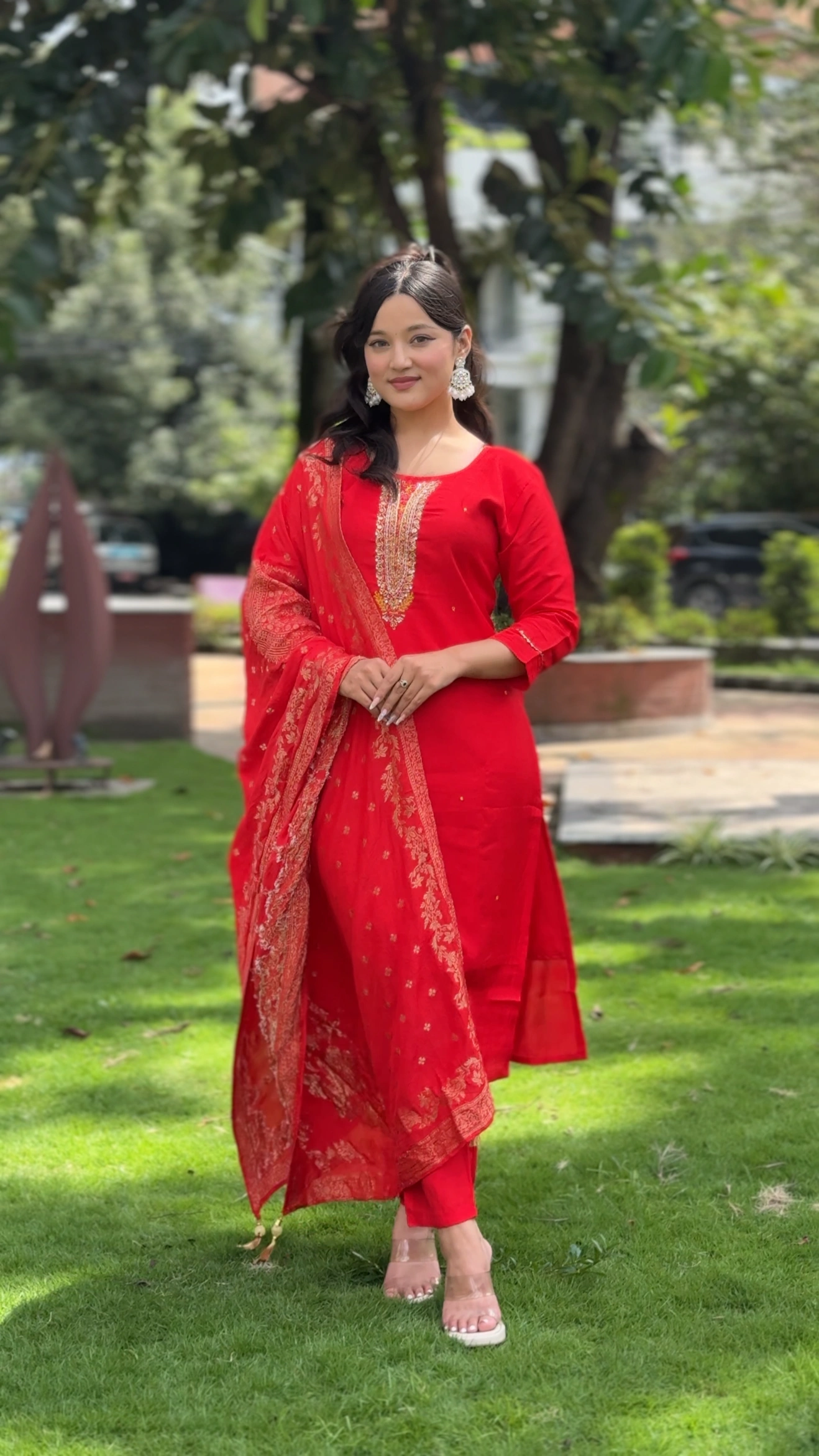 The set is complemented by a matching red dupatta adorned with intricate thread and zari embroidery, lending a regal finishing touch. With its refined silhouette and radiant hue, this outfit perfectly balances tradition and elegance, making it ideal for weddings, festivals, and cultural events.