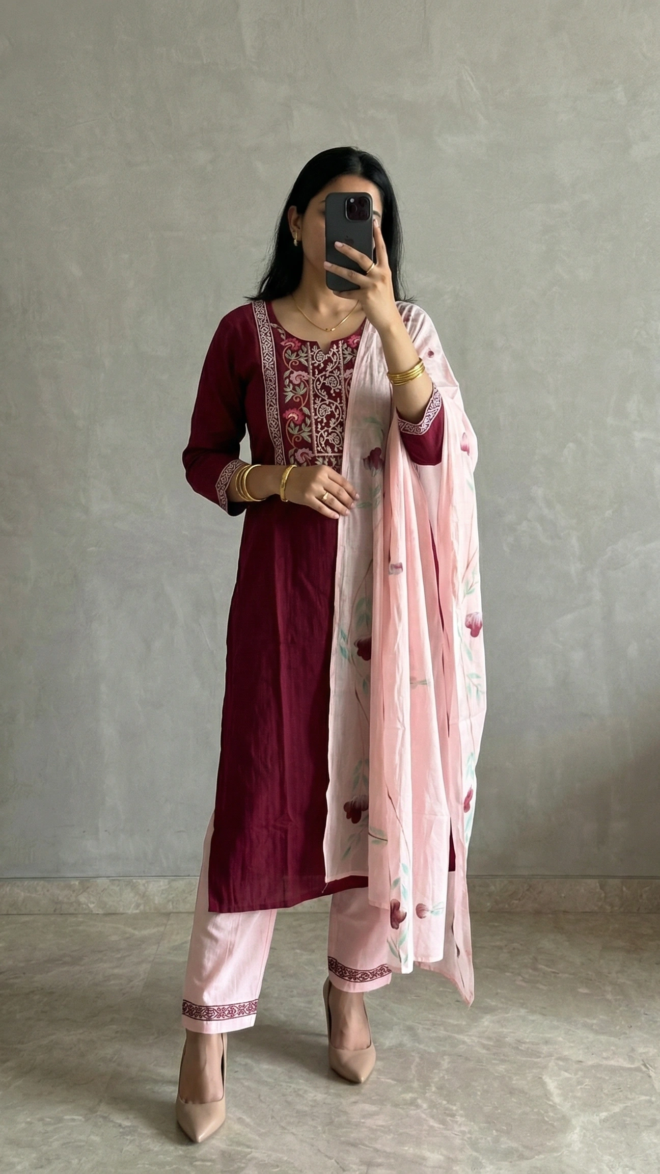 The kurthi features a beautiful red base with intricate floral embroidery on the neckline, adding a refined and graceful detail to the design. Paired with matching red pants and a coordinated dupatta, the set creates a complete and stylish ethnic look. The soft and breathable fabric ensures comfort while maintaining a flattering silhouette for all-day wear.