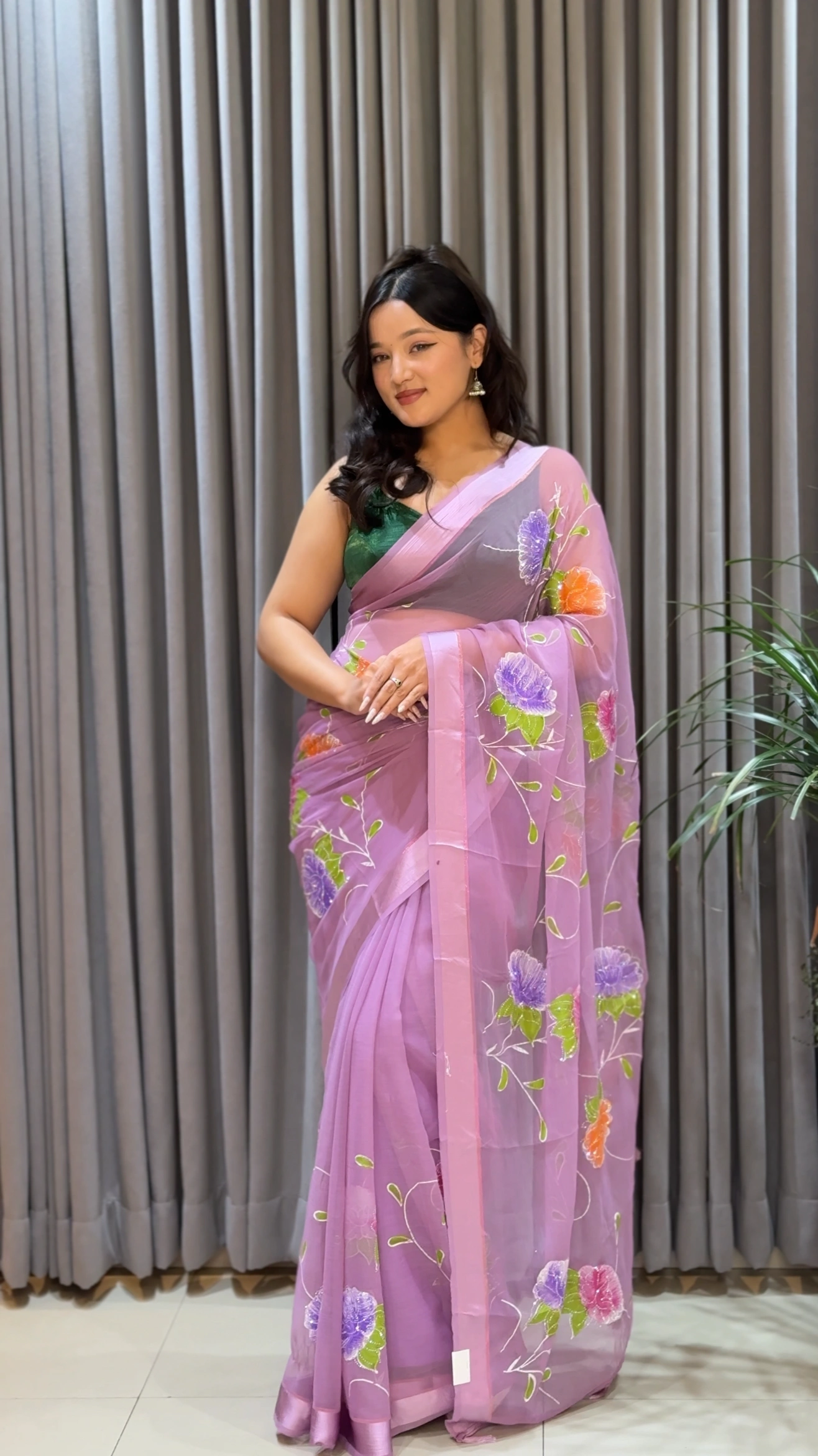 Grace your wardrobe with this exquisite lavender chiffon saree that blends softness, elegance, and artistic beauty. Crafted from premium chiffon, this saree offers a lightweight, airy feel with a smooth, flowing drape. The delicate hand painted floral motifs add a refined artistic touch, making it a standout choice for both festive and elegant occasions.