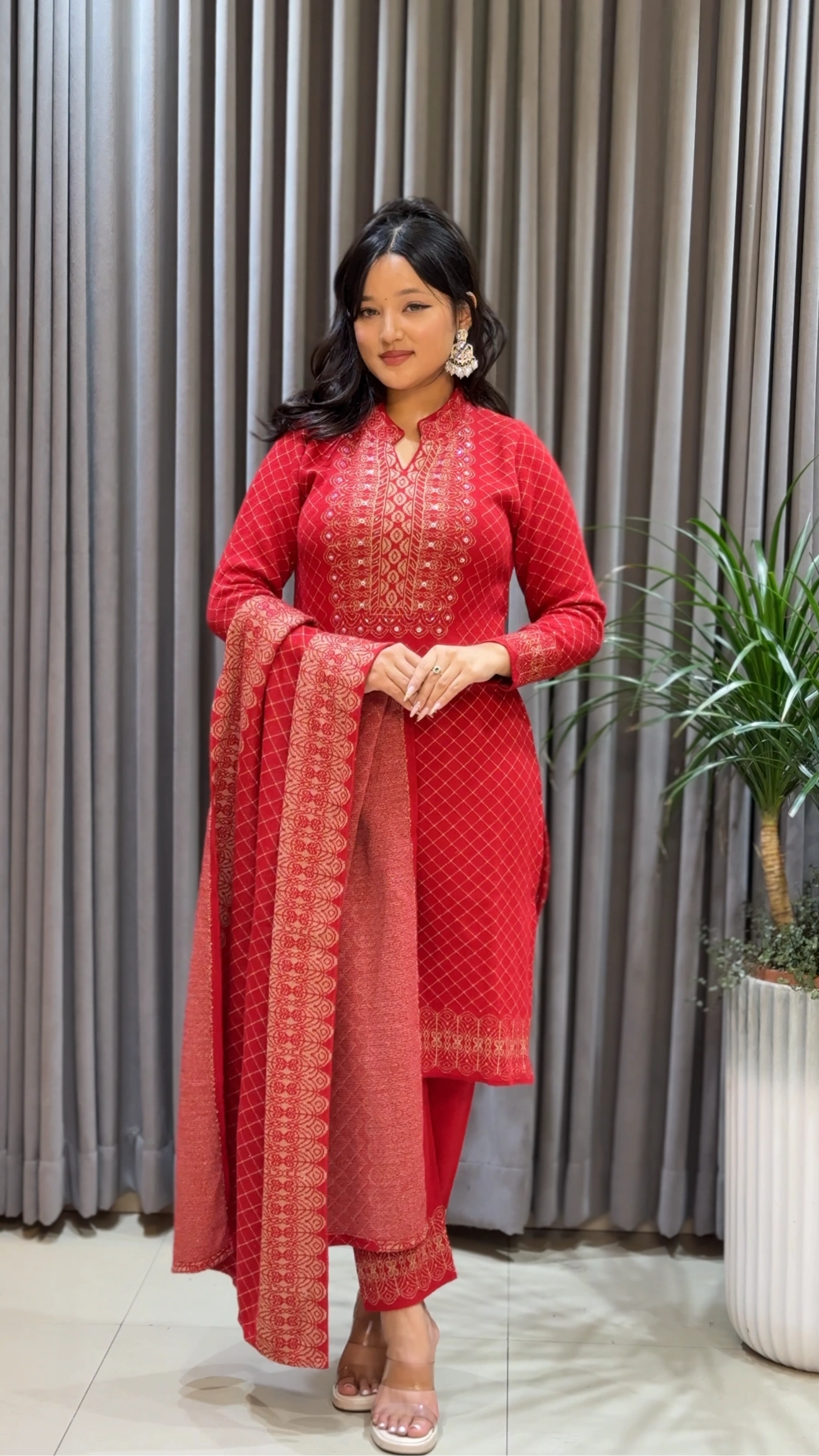 This image beautifully captures a woman radiating grace and confidence in a stunning red woolen embroidered set. Crafted from premium wool, this ensemble features a sophisticated neckline accentuated with intricate golden thread embroidery that extends elegantly along the front panel, sleeves, and borders. The fine craftsmanship and detailed patterns add a touch of timeless allure and refined artistry. The rich red hue enhances the ensemble’s regal charm—making it perfect for festive occasions, gatherings, and elegant winter wear.