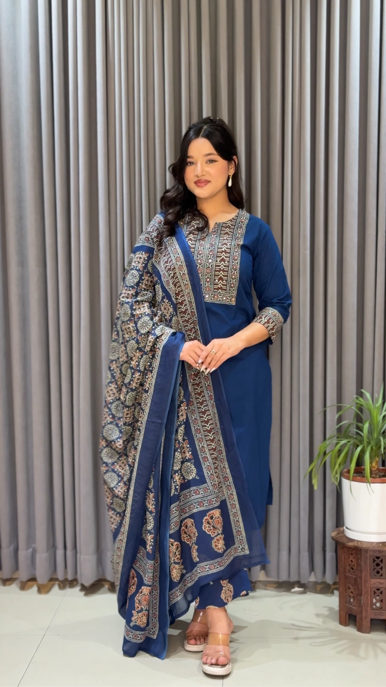 Paired with a coordinated printed pant and a statement dupatta adorned with detailed Kalamkari-inspired motifs, this outfit is perfect for festive gatherings, cultural occasions, or graceful everyday wear. The deep blue tone enhances its sophistication while ensuring a timeless appeal.