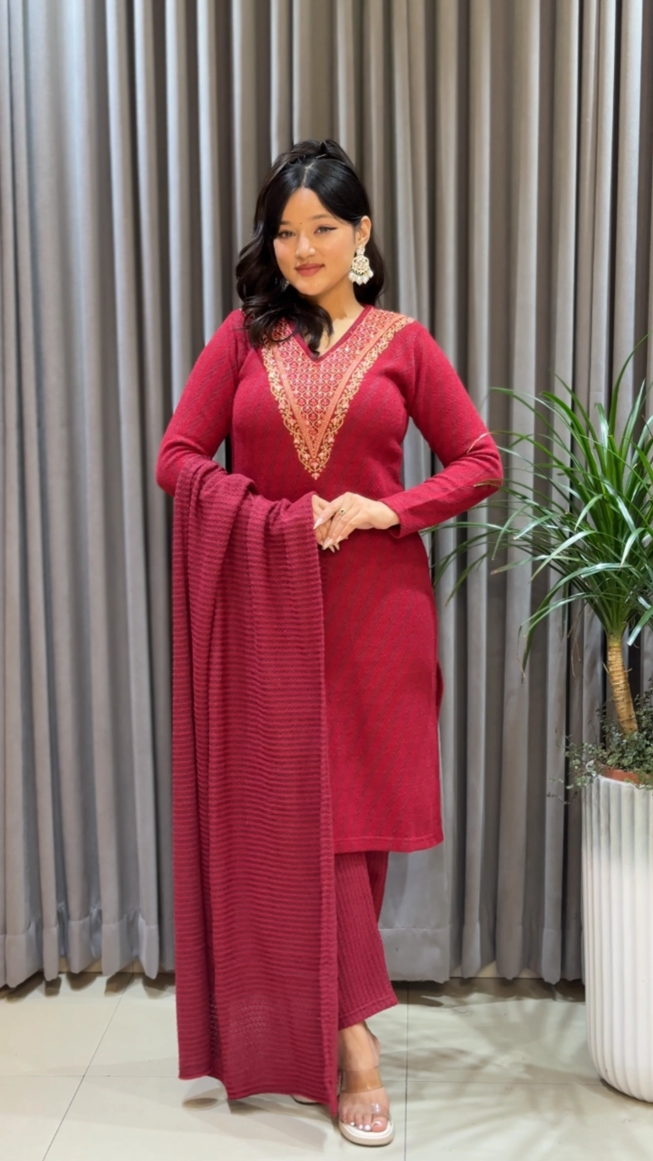 This image beautifully captures a woman radiating confidence and grace in a rich maroon woolen embroidered set. Crafted from premium wool, this ensemble showcases intricate golden thread embroidery along the neckline, sleeves, and borders—exemplifying refined craftsmanship and timeless elegance. The deep maroon hue adds a touch of regal charm and warmth, making it perfect for cultural celebrations, family gatherings, and elegant winter occasions.