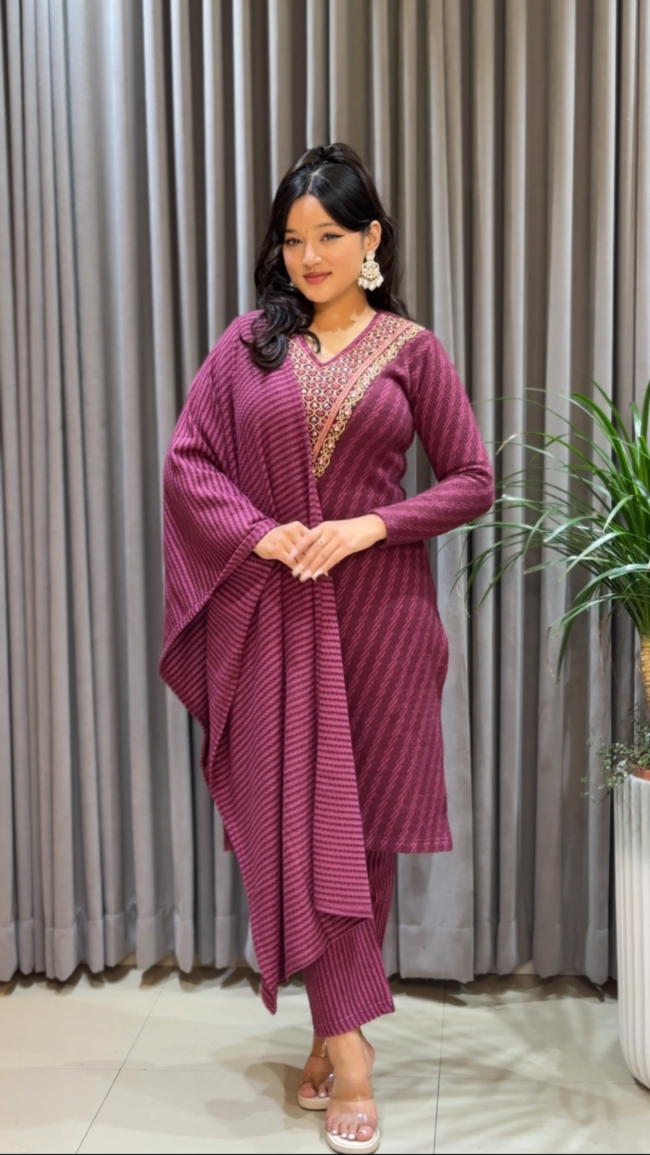 This image beautifully captures a woman radiating confidence and grace in a deep purple woolen embroidered set. Crafted from premium wool, this ensemble showcases intricate golden thread embroidery along the neckline, sleeves, and borders—exemplifying refined craftsmanship and timeless elegance. The rich purple hue adds a touch of royal charm and sophistication, making it perfect for cultural celebrations, family gatherings, and elegant winter occasions.