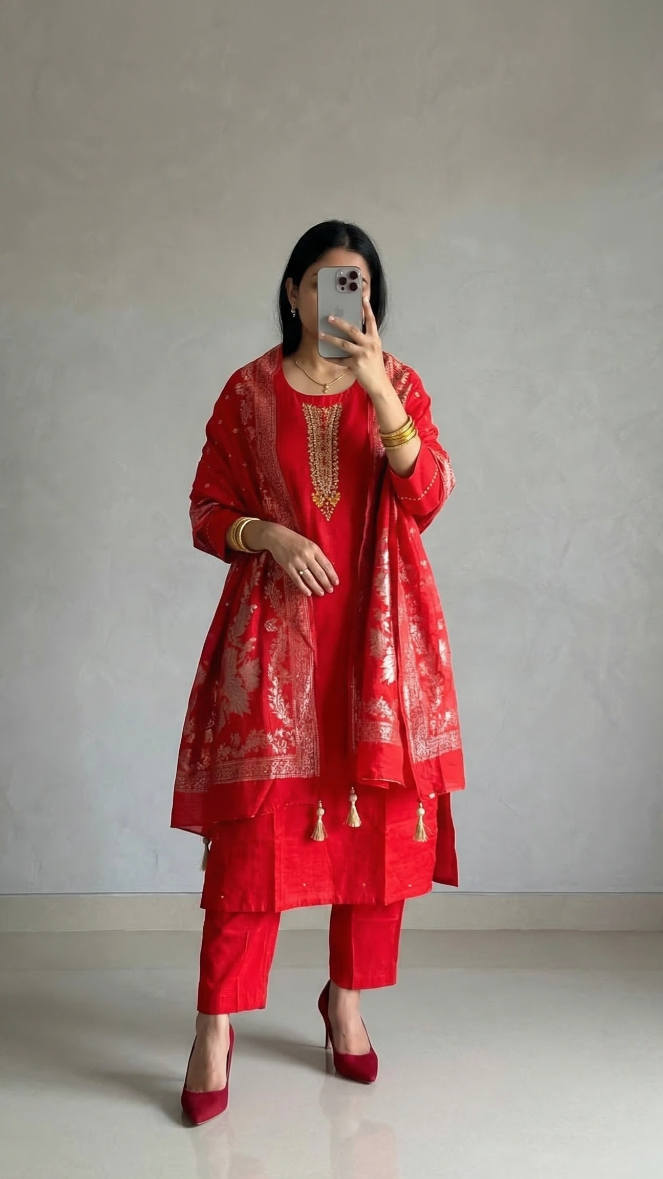 Elevate your festive wardrobe with this elegant scarlet red kurthi set from Shreevastralaya. The kurthi features beautiful golden embroidery on the neckline that adds a touch of traditional charm and sophistication. Paired with matching straight pants and a richly printed dupatta adorned with intricate motifs and tassel detailing, this ensemble creates a graceful and festive look. Designed for both comfort and style, this set is perfect for celebrations, family gatherings, and special occasions while offering a flattering silhouette for modern women.