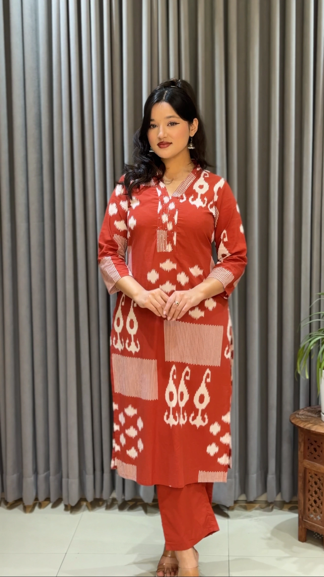 Elevate your everyday elegance with our Rust Ikat Grace Co-ord Set, thoughtfully designed for comfort and effortless style. Crafted from breathable, soft cotton fabric, this set features a beautifully patterned kurta with traditional ikat-inspired motifs that add a touch of cultural charm. The straight-cut silhouette paired with matching pants creates a refined yet relaxed look, perfect for both casual outings and semi-formal occasions.