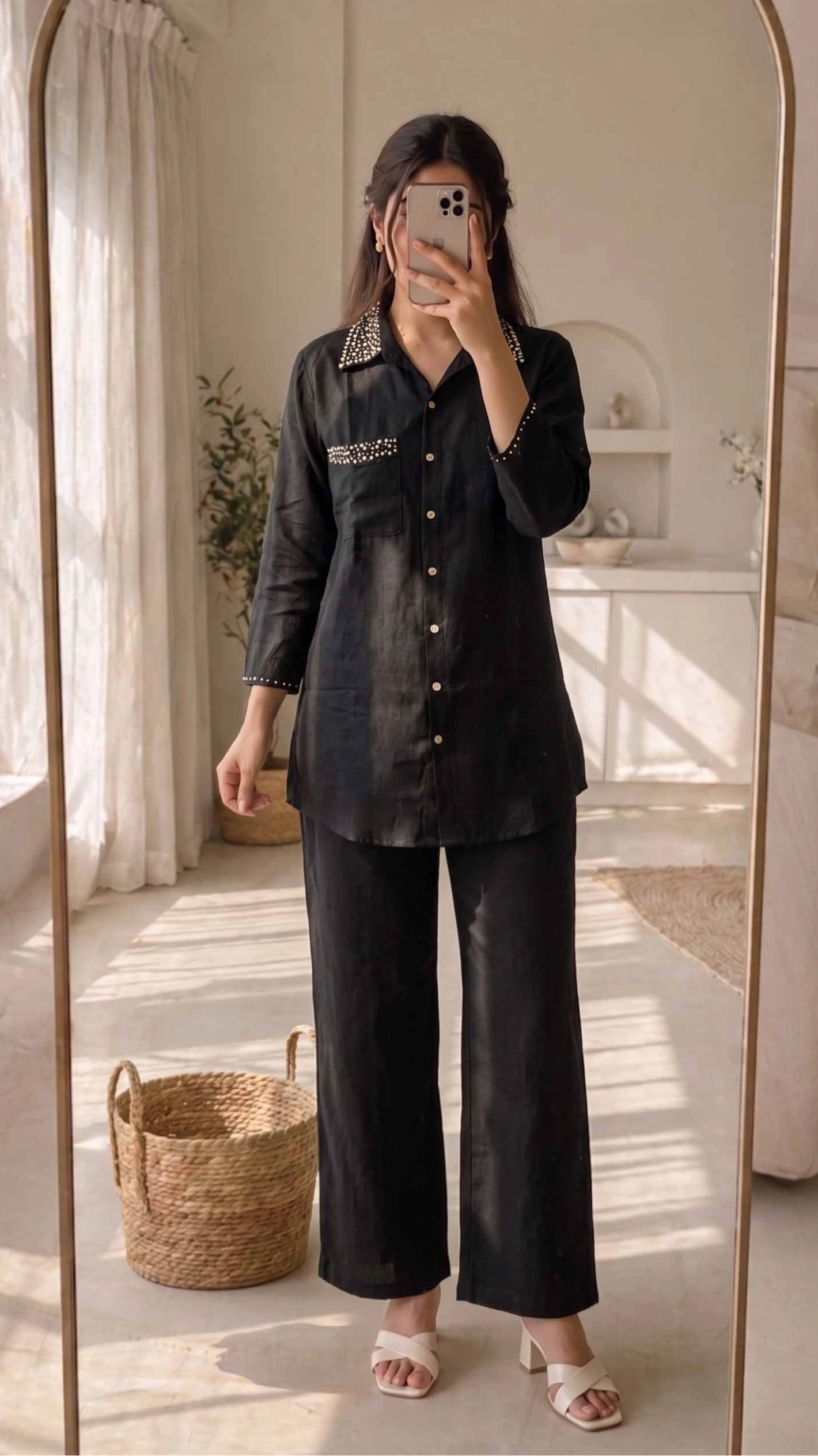 Step into effortless sophistication with this sleek black co-ord set from SHREEVASTRALAYA. Designed for modern minimalism, the outfit features a relaxed-fit button-down shirt paired with straight-cut pants. The subtle stud embellishments on the collar, pocket, and cuffs add a refined touch of glam, making it perfect for both casual outings and semi-formal occasions. Crafted in a breathable, lightweight fabric, this set ensures all-day comfort while keeping your style polished and chic.