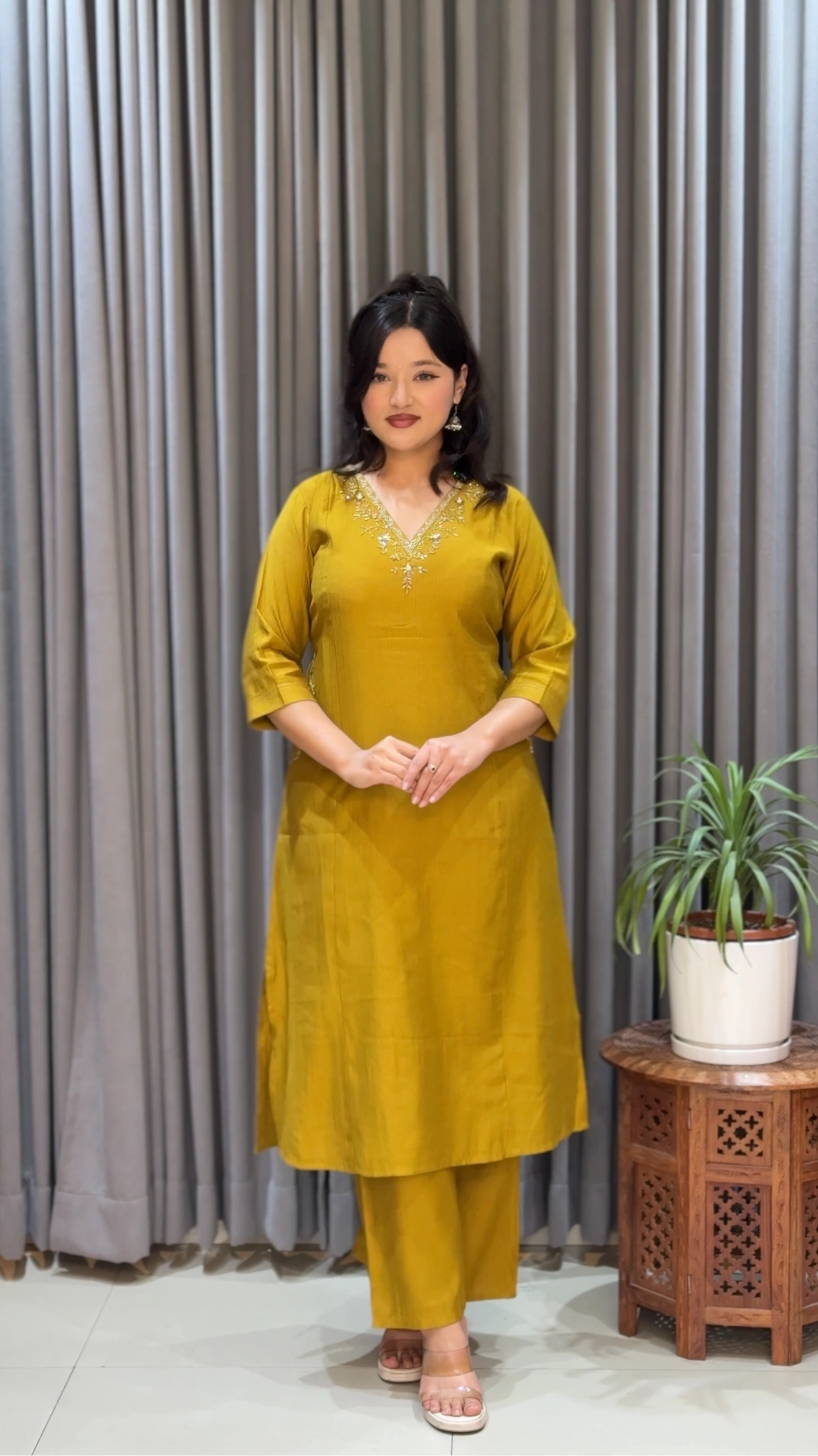 Add warmth and elegance to your ethnic wardrobe with the Mustard Raw Silk Kurthi with pant from Shreevastralaya. Crafted from premium raw silk fabric, this outfit offers a rich texture and graceful finish that instantly elevates your look.