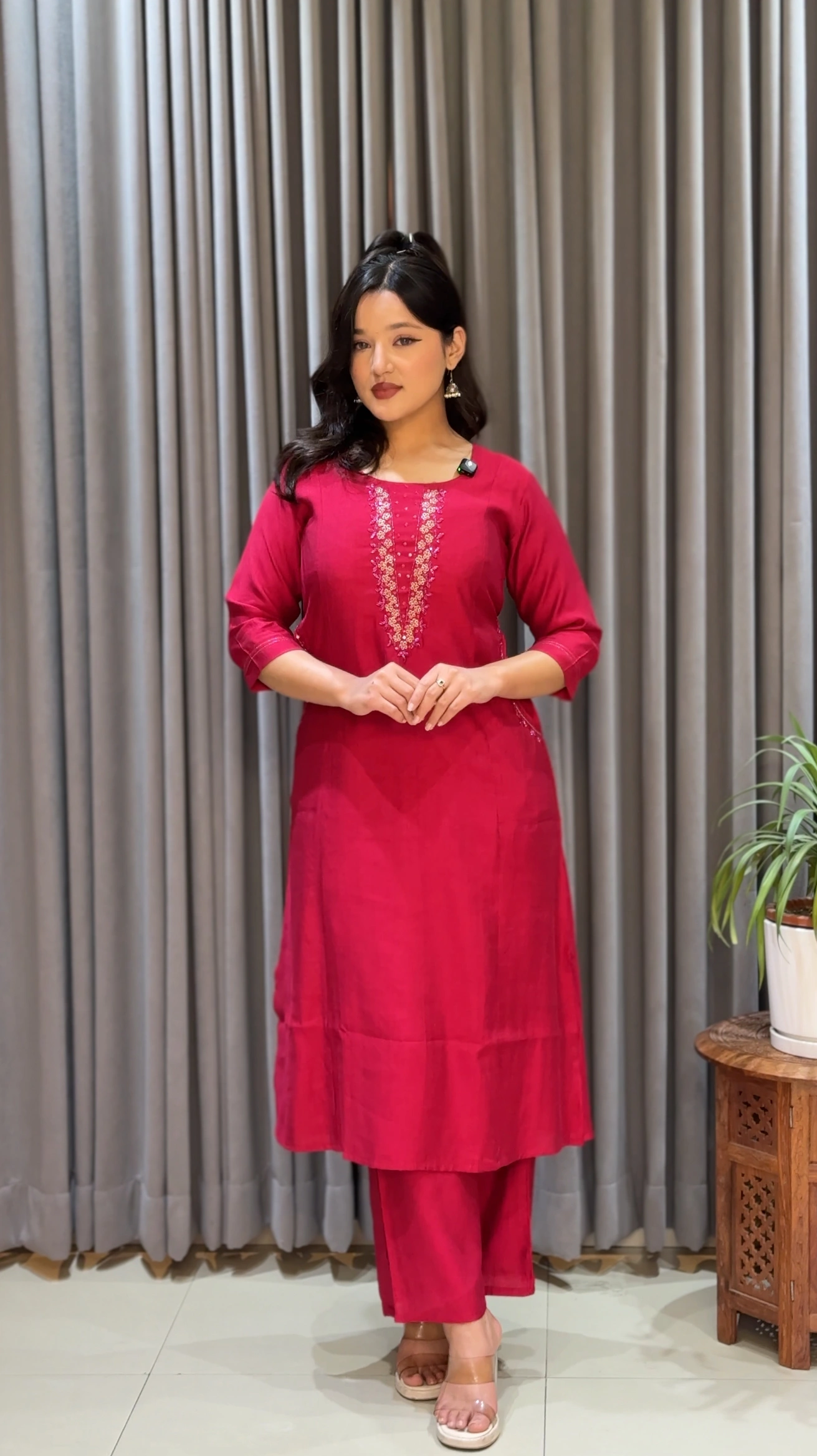The beautiful pink kurthi features a delicately embroidered neckline that enhances its elegant appeal while keeping the design simple and sophisticated. The straight silhouette provides a flattering fit and ensures comfort throughout the day.