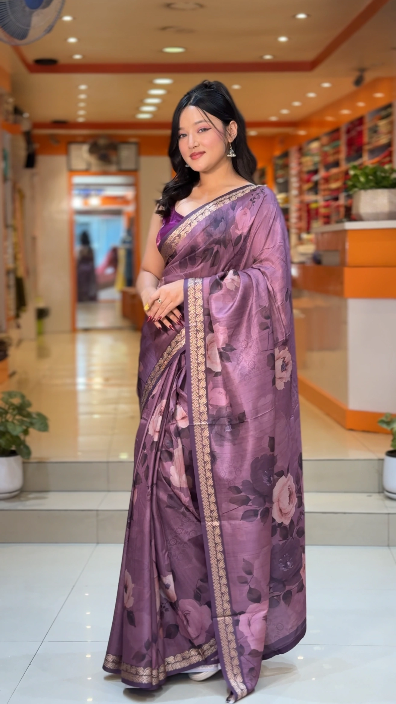 This image beautifully captures a woman radiating poise in a stunning purple-toned South silk saree. Designed to reflect timeless grace and sophistication, this saree features delicate floral prints that blend seamlessly with the silk’s natural sheen. The luxurious drape and lustrous finish create a regal appeal, making it perfect for festive celebrations, cultural gatherings, and elegant occasions.