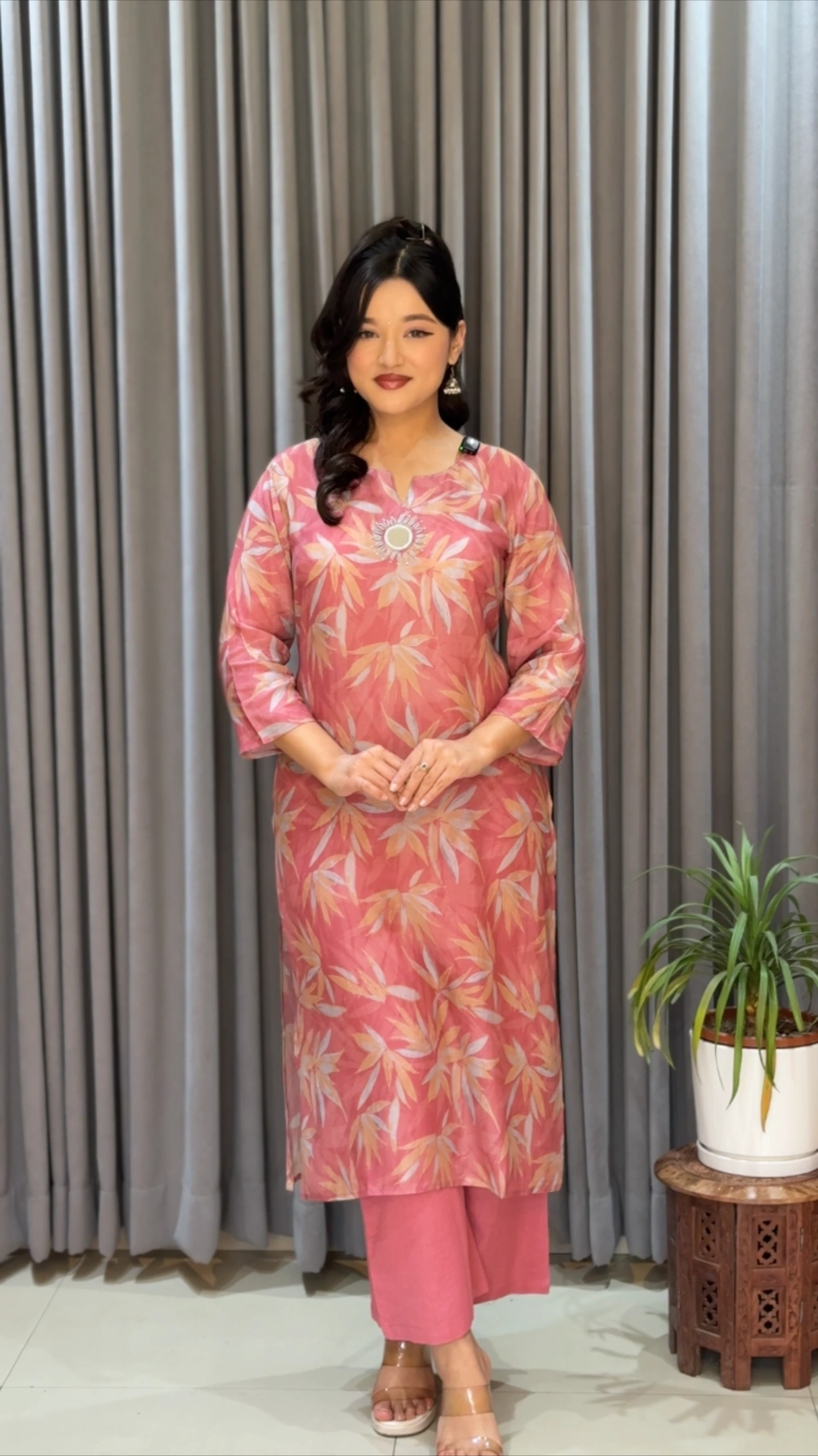 The soothing blush tone combined with delicate botanical patterns makes it a standout piece for women who love subtle sophistication. Its lightweight fabric ensures all-day ease, while the tailored silhouette enhances your natural grace.