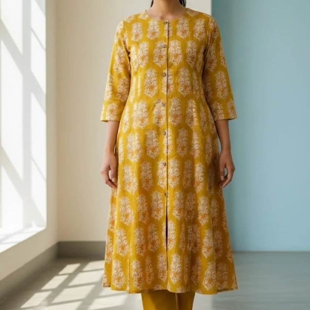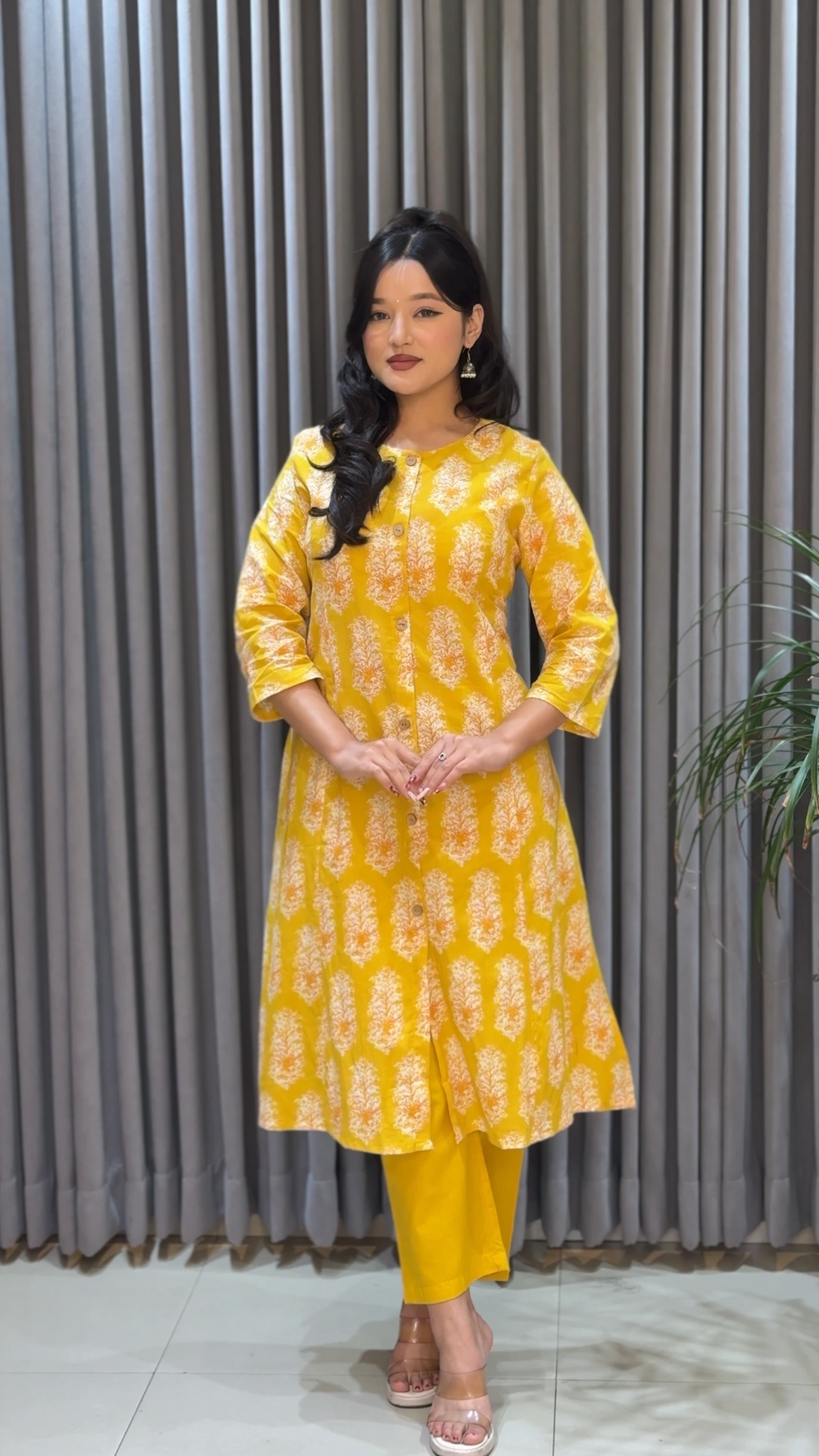 Bring effortless elegance to everyday dressing with this sunlit mustard A-line kurta set. Crafted in a soft, breathable fabric, the kurta features a delicate all-over floral-inspired print that adds subtle texture and charm. The front button-down detailing and three-quarter sleeves create a clean, contemporary silhouette, while the flared hem ensures ease of movement and comfort throughout the day. Paired with matching straight-fit pants, this ensemble is perfect for casual outings, workwear, or relaxed festive gatherings. The warm mustard tone enhances its timeless appeal, making it a versatile addition to any wardrobe.