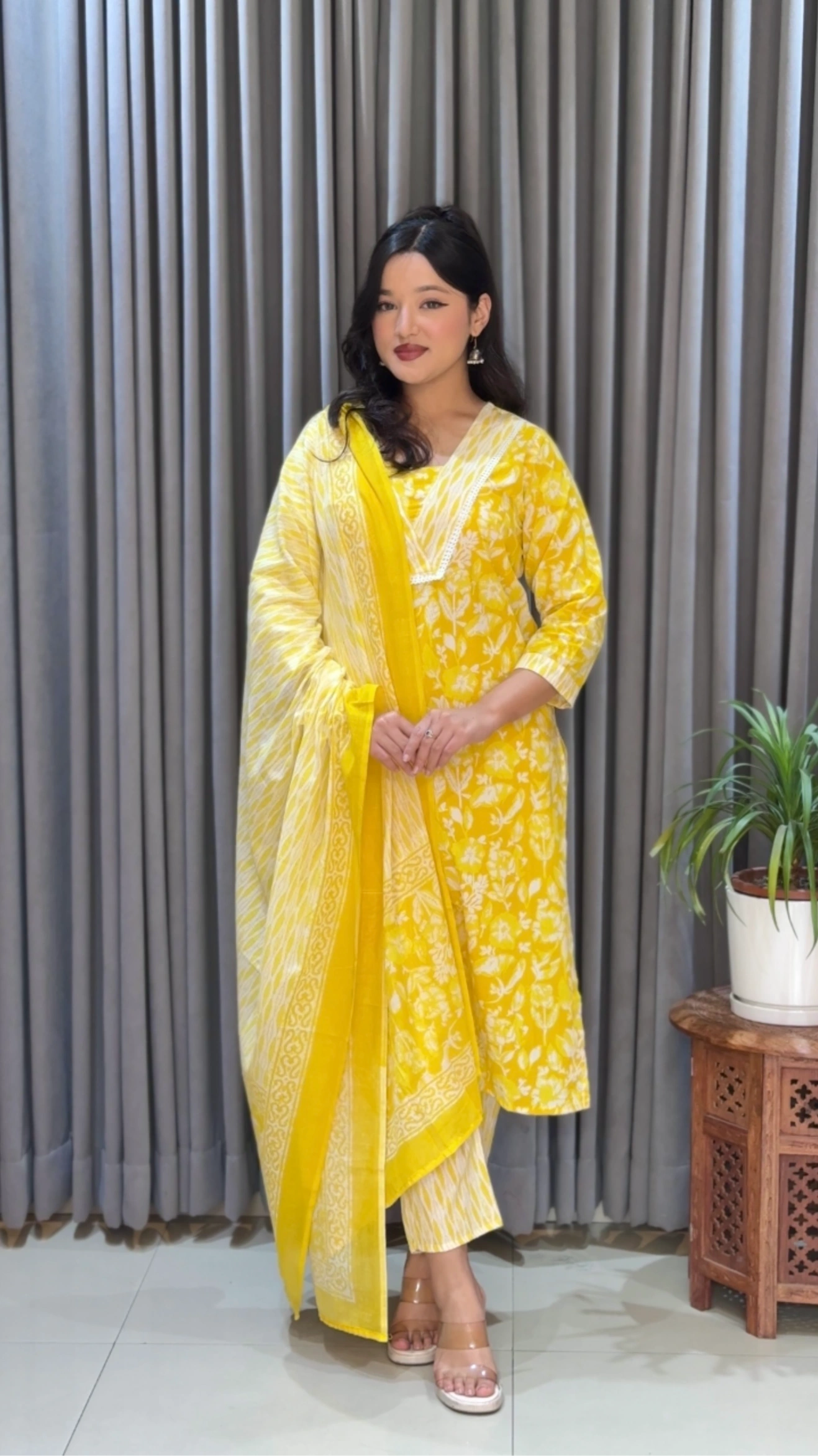 Brighten your ethnic wardrobe with the graceful Sunshine Bloom Kurthi Set from Shreevastralaya, a proudly Nepal-based fashion brand known for elegant and comfortable designs. This beautiful outfit features a vibrant yellow kurthi decorated with delicate white floral prints that bring a fresh and cheerful appeal.