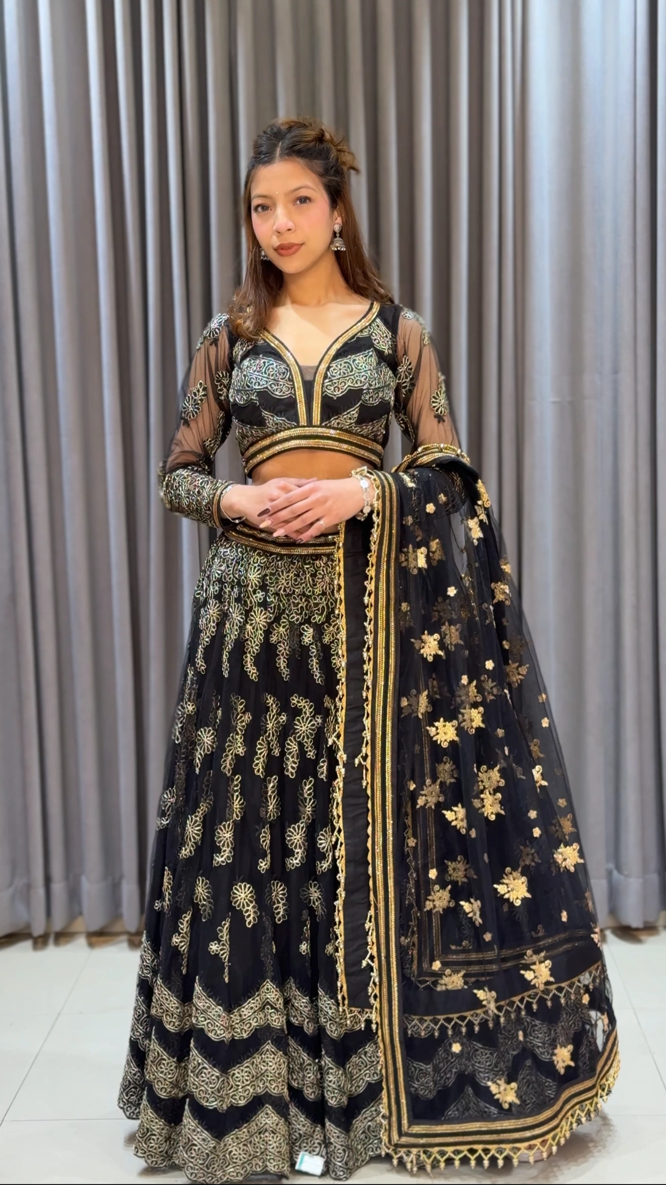 This graceful black lehenga set is richly decorated with intricate gold embroidery, giving it a royal and timeless appeal. The V-neck choli features elegant embroidery with sheer full sleeves, perfectly complemented by a heavily embroidered flared skirt. The look is completed with a beautifully detailed net dupatta finished with a gold border, making it ideal for weddings, receptions, and festive celebrations.