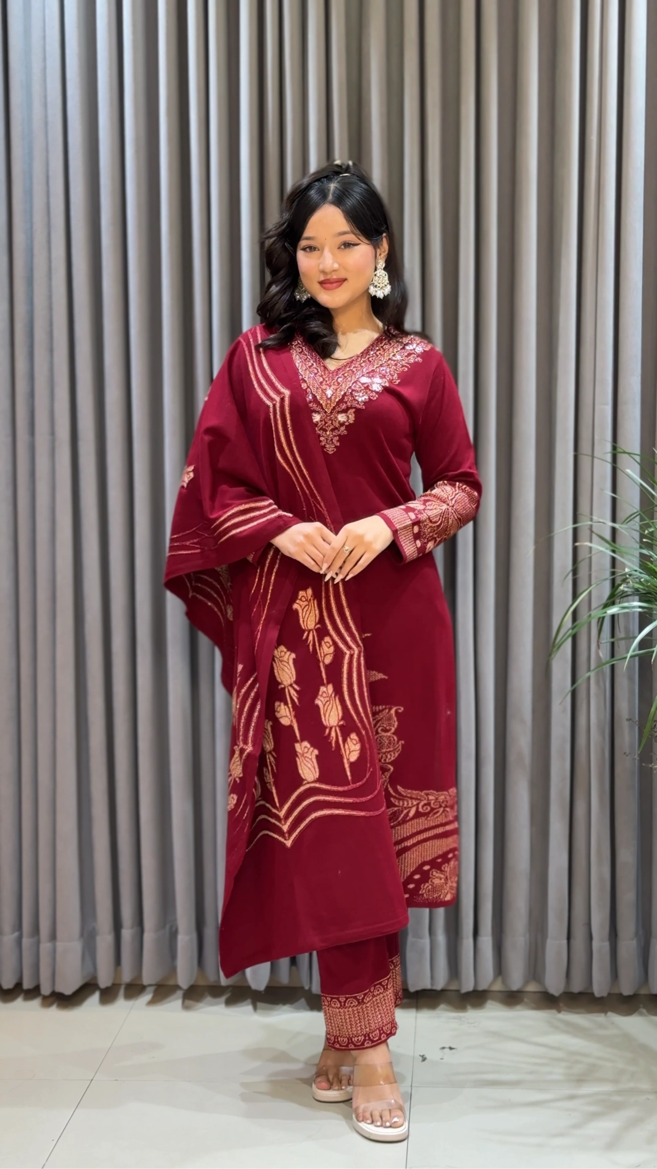 This image beautifully captures a woman radiating warmth and poise in a rich maroon woolen embroidered set. Designed to embody timeless sophistication, this ensemble showcases exquisite thread embroidery accentuating the V-neckline, sleeves, and borders—reflecting intricate artistry and elegant craftsmanship. The deep maroon tone exudes a royal charm, making it a perfect choice for festive celebrations, family gatherings, and refined winter soirées.