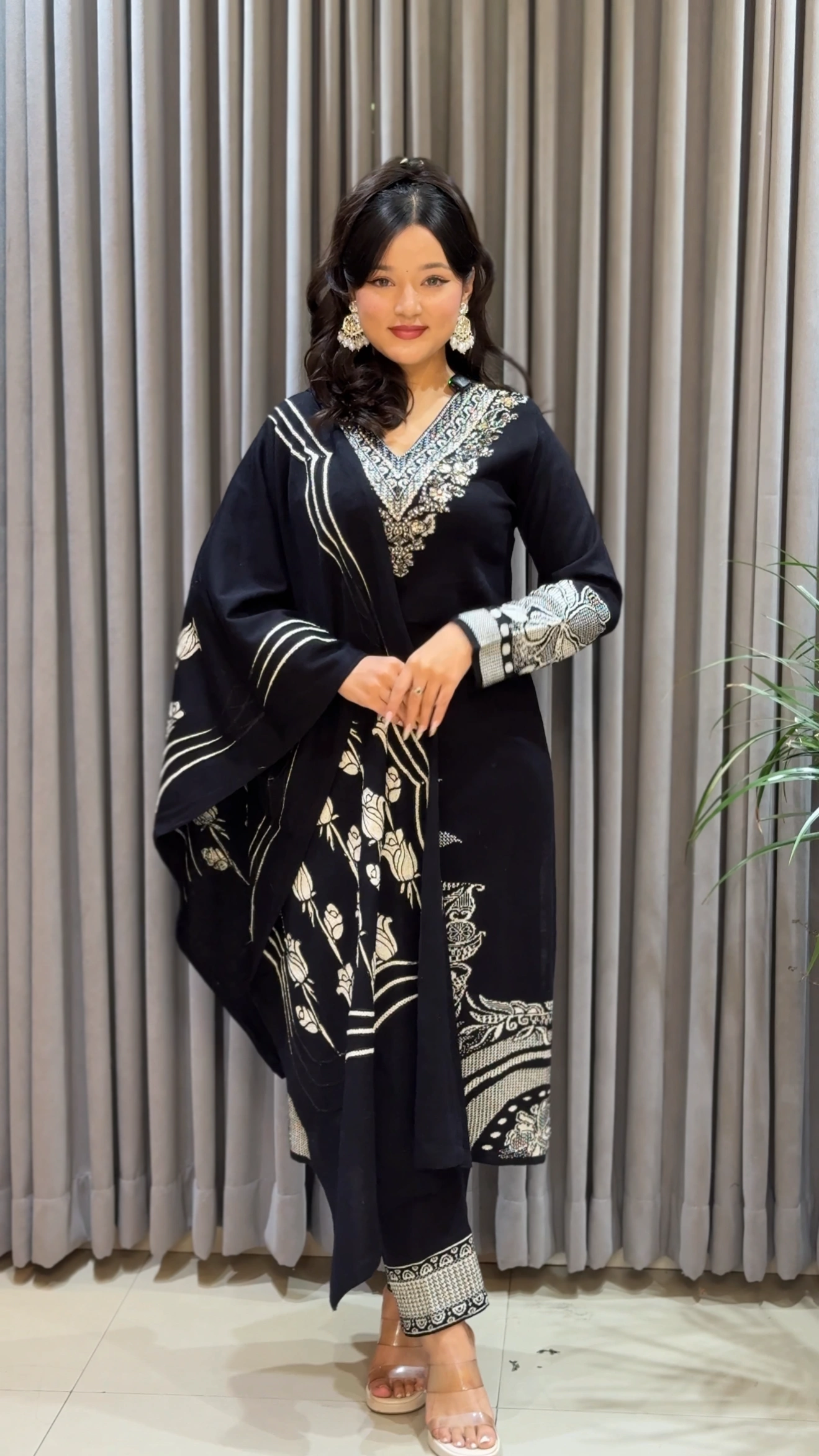 This image beautifully captures a woman radiating elegance and confidence in a stunning black woolen embroidered set. Designed with refined sophistication, this ensemble features exquisite thread embroidery gracefully highlighting the V-neckline, sleeves, and borders. The rich black hue exudes timeless allure, perfectly blending tradition with modern charm—making it ideal for festive occasions, cultural events, and elegant winter evenings.
