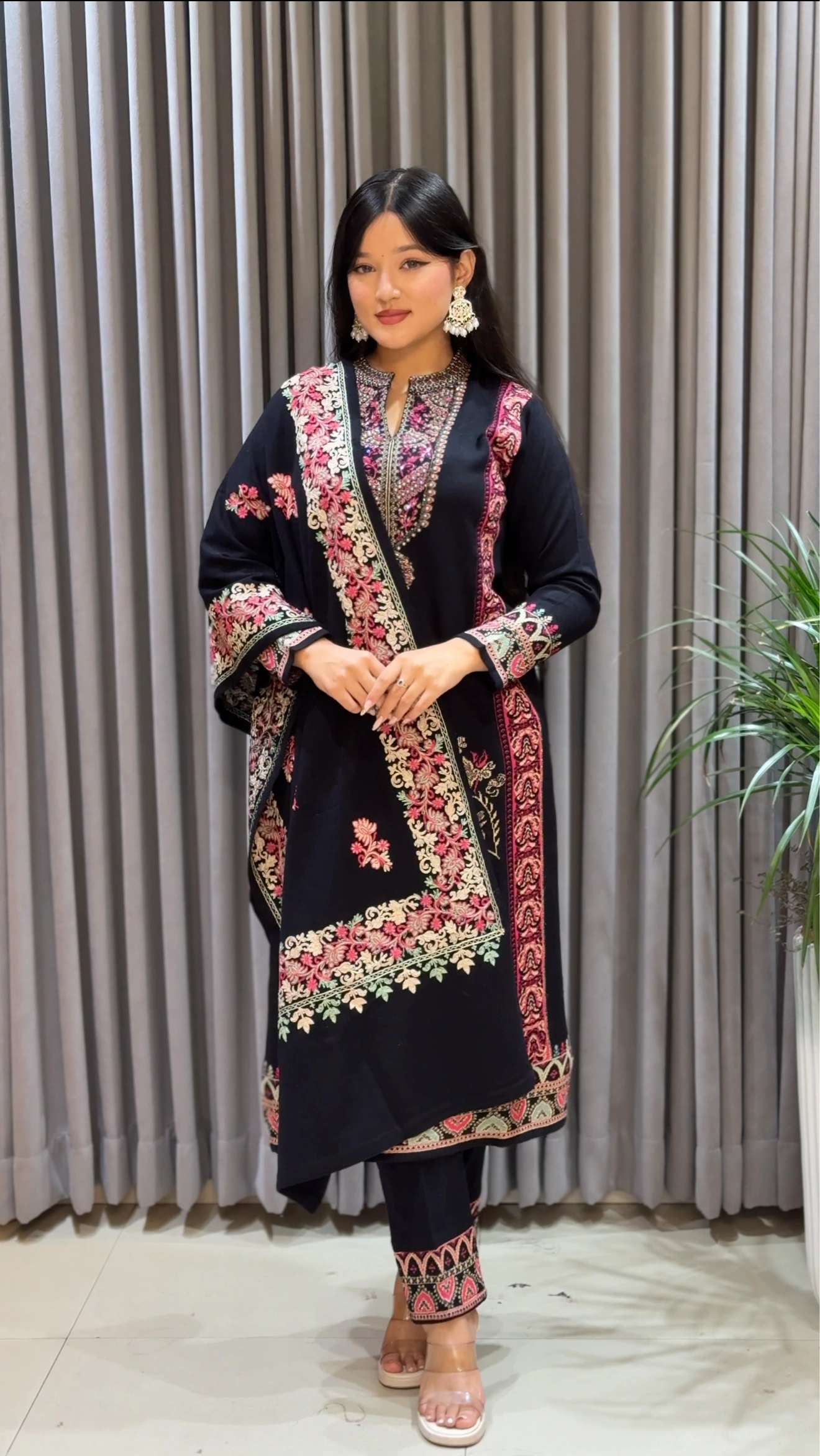 This image beautifully captures a woman exuding timeless elegance in a stunning black woolen embroidered set. Designed with a refined close-neck silhouette featuring a subtle V-slit, this ensemble perfectly balances tradition with modern sophistication. Intricate thread embroidery graces the neckline, sleeves, and borders—enhancing the luxurious craftsmanship and elevating the overall appeal. The deep black hue radiates poise and versatility, making it ideal for festive occasions, evening gatherings, and elegant winter events.