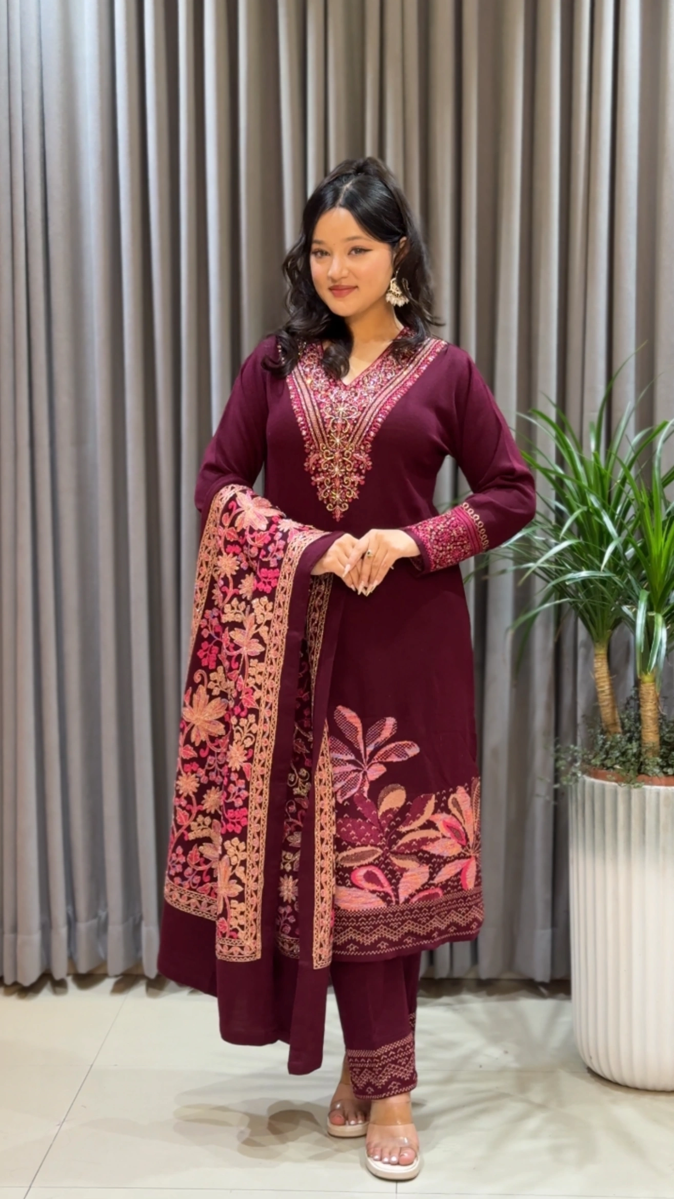 This image beautifully captures a woman exuding timeless grace in a captivating purple V-neck woolen embroidered set. Designed to embody elegance and comfort, this ensemble features exquisite thread embroidery along the neckline, sleeves, and borders—showcasing refined craftsmanship. The rich purple hue adds a regal touch, making it an ideal choice for festive occasions, cultural gatherings, and elegant winter celebrations.
