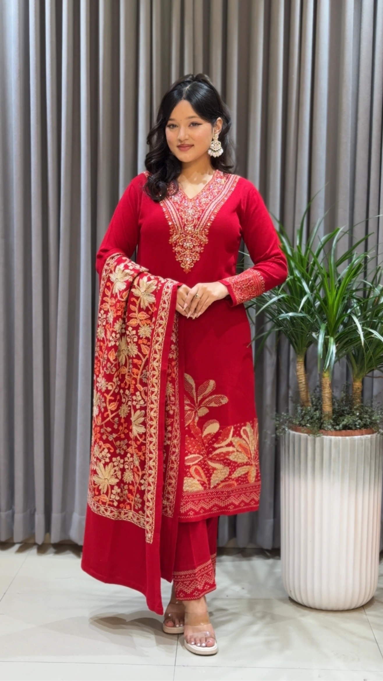 This image beautifully captures a woman radiating confidence and warmth in a stunning red V-neck woolen embroidered set. Designed to blend tradition with modern sophistication, this ensemble features intricate thread embroidery along the neckline, sleeves, and borders—reflecting fine craftsmanship and attention to detail. The vibrant red hue symbolizes grace and celebration, making it a perfect choice for festive occasions, cultural gatherings, and special winter events.