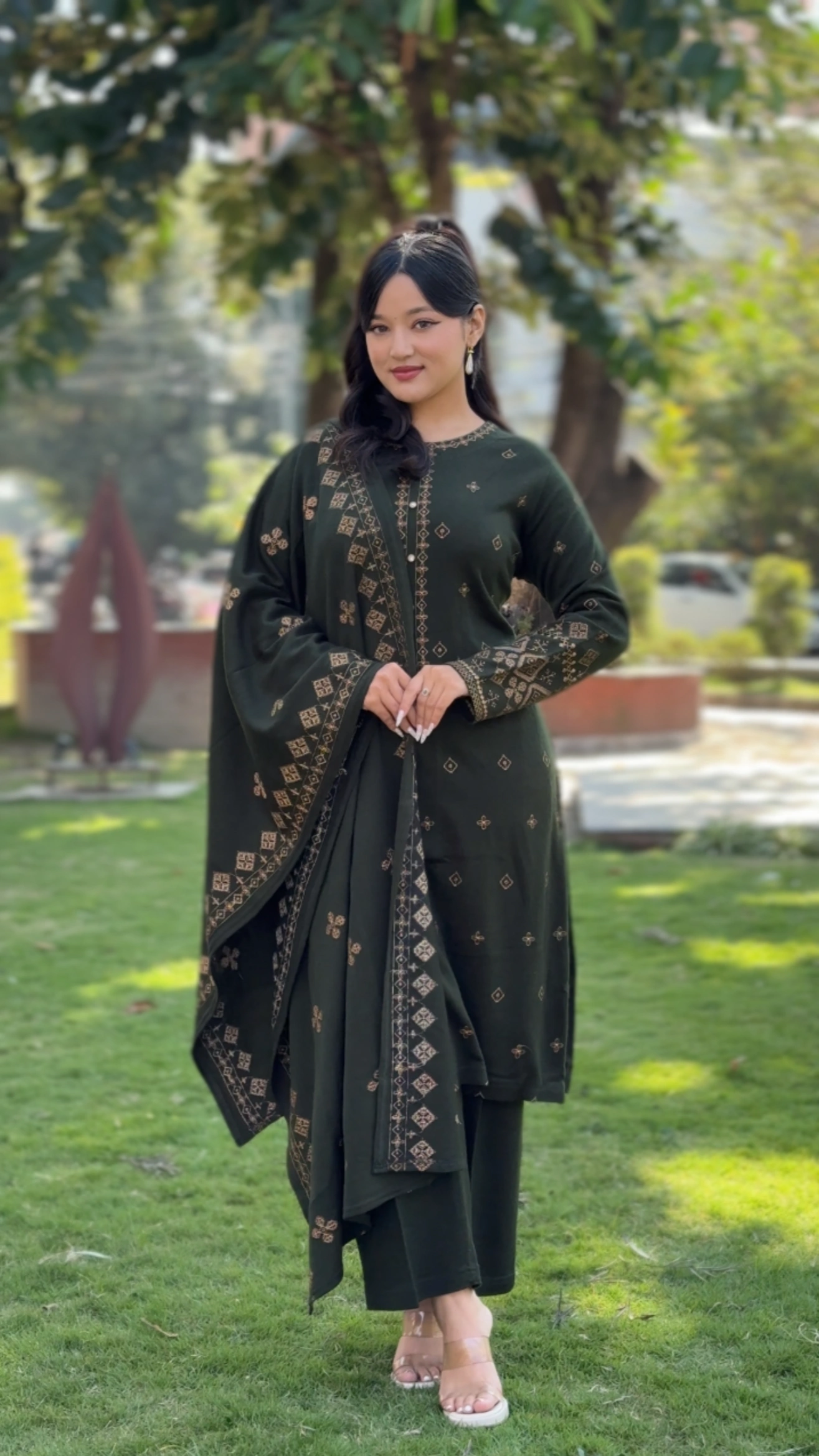 This image beautifully captures a woman radiating refined elegance in a stunning navy green woolen embroidered shawl set. Crafted from premium wool, the outfit offers warmth, comfort, and a luxurious winter drape. The kurtha, in a rich emerald-navy green tone, features delicate embroidery that subtly enhances its regal presence.