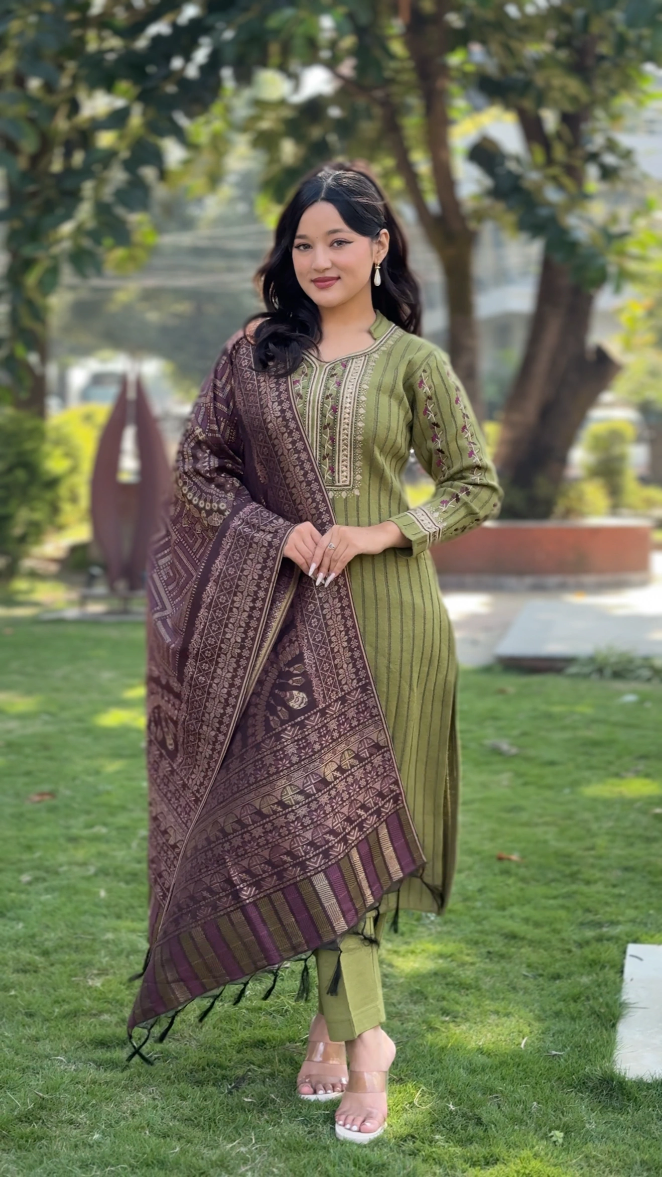 The standout element of this set is the beautifully woven shawl in a bold purple shade, adorned with intricate motifs and detailed bordered patterns. The warm contrast between the shawl and the kurtha creates a striking yet harmonious winter palette. Draped elegantly, the shawl brings a premium, heritage-inspired finish to the entire outfit. Paired with matching woolen pants, this set delivers a complete, royal winter look suitable for both everyday and special moments.