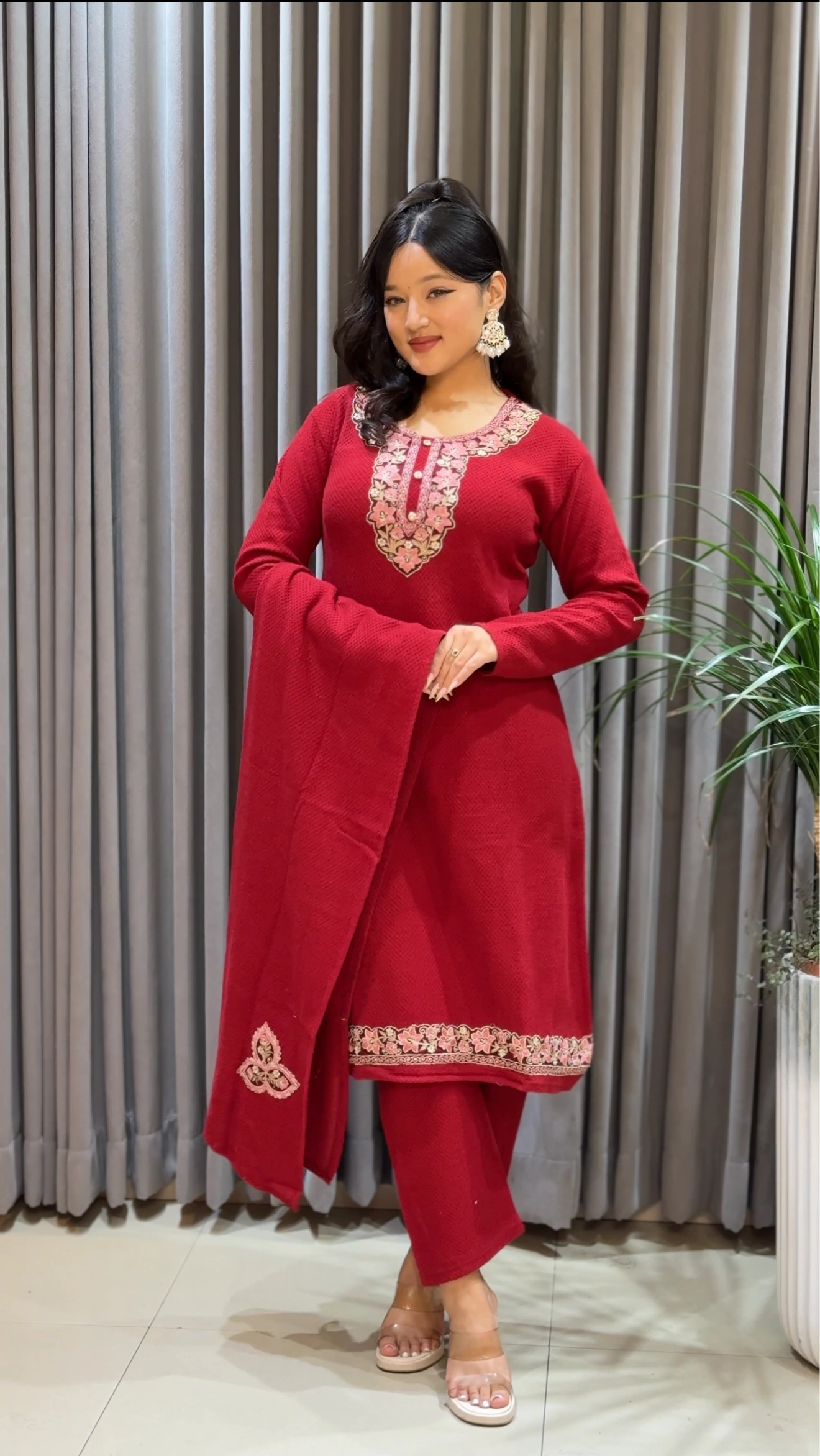 This image beautifully captures a woman radiating elegance and confidence in a stunning red woolen embroidered set. Crafted from premium-quality wool, this ensemble combines cozy warmth with refined craftsmanship, making it a perfect addition to your winter wardrobe. The neckline is adorned with intricate floral embroidery in golden and pink tones, creating a striking contrast that enhances the richness of the red hue.