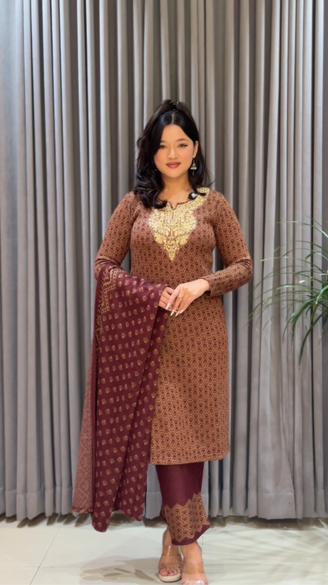 Designed for women who value both comfort and elegance, this brown color woolen suit set is an essential addition to your winter wardrobe.