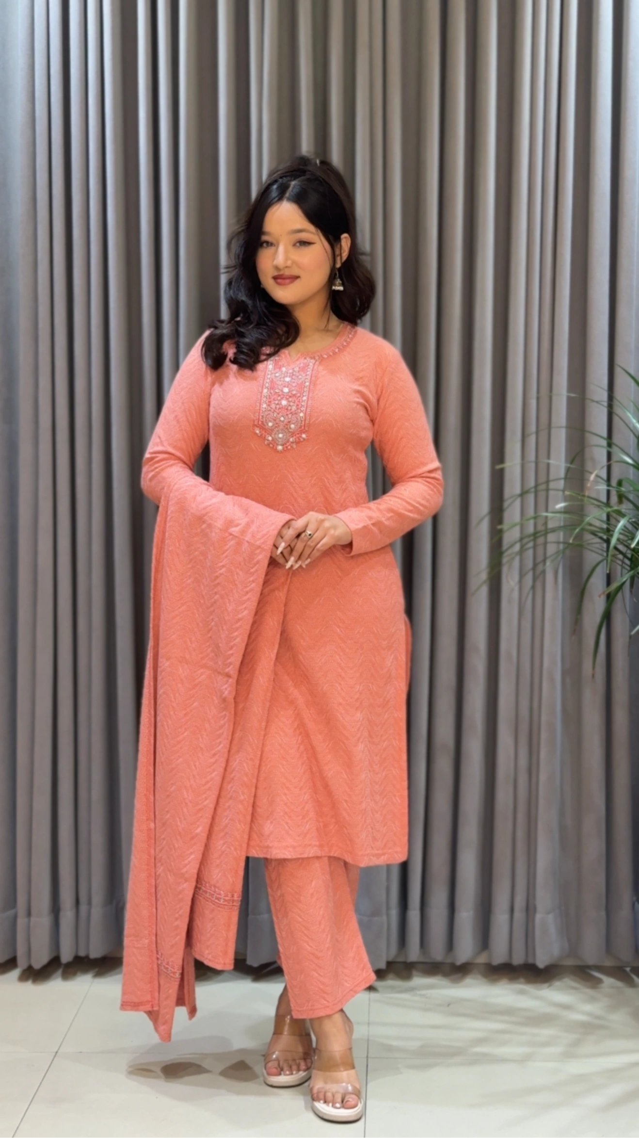 Designed for women who value both comfort and elegance, this peach color woolen suit set is an essential addition to your winter wardrobe.