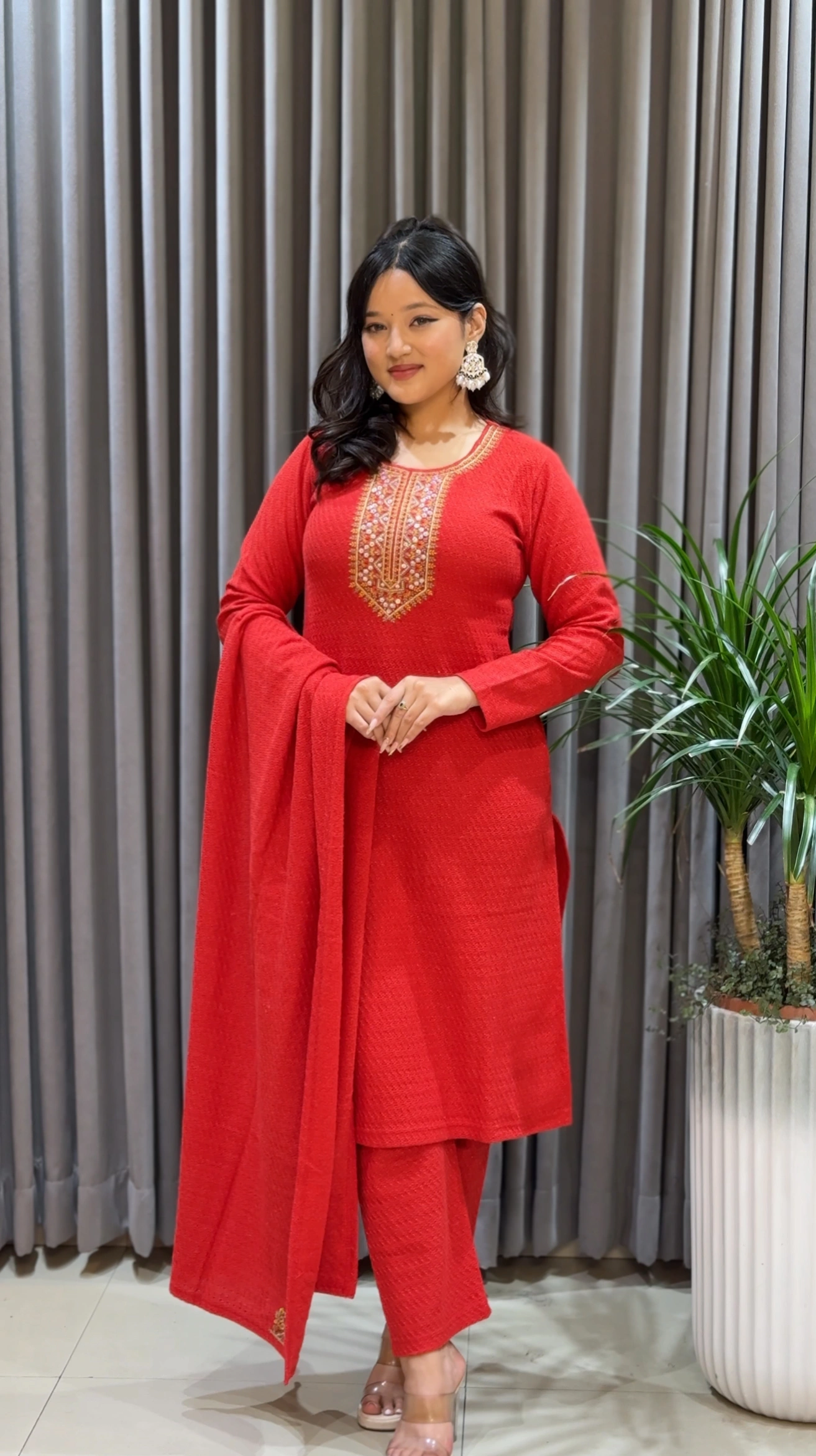 This image beautifully captures a woman radiating grace and confidence in a stunning red woolen embroidered set. Crafted from premium wool, this ensemble features a sophisticated neckline accentuated with intricate golden thread embroidery that extends elegantly along the front panel, sleeves, and borders. The fine craftsmanship and detailed patterns add a touch of timeless allure and refined artistry. The rich red hue enhances the ensemble’s regal charm—making it perfect for festive occasions, gatherings, and elegant winter wear.