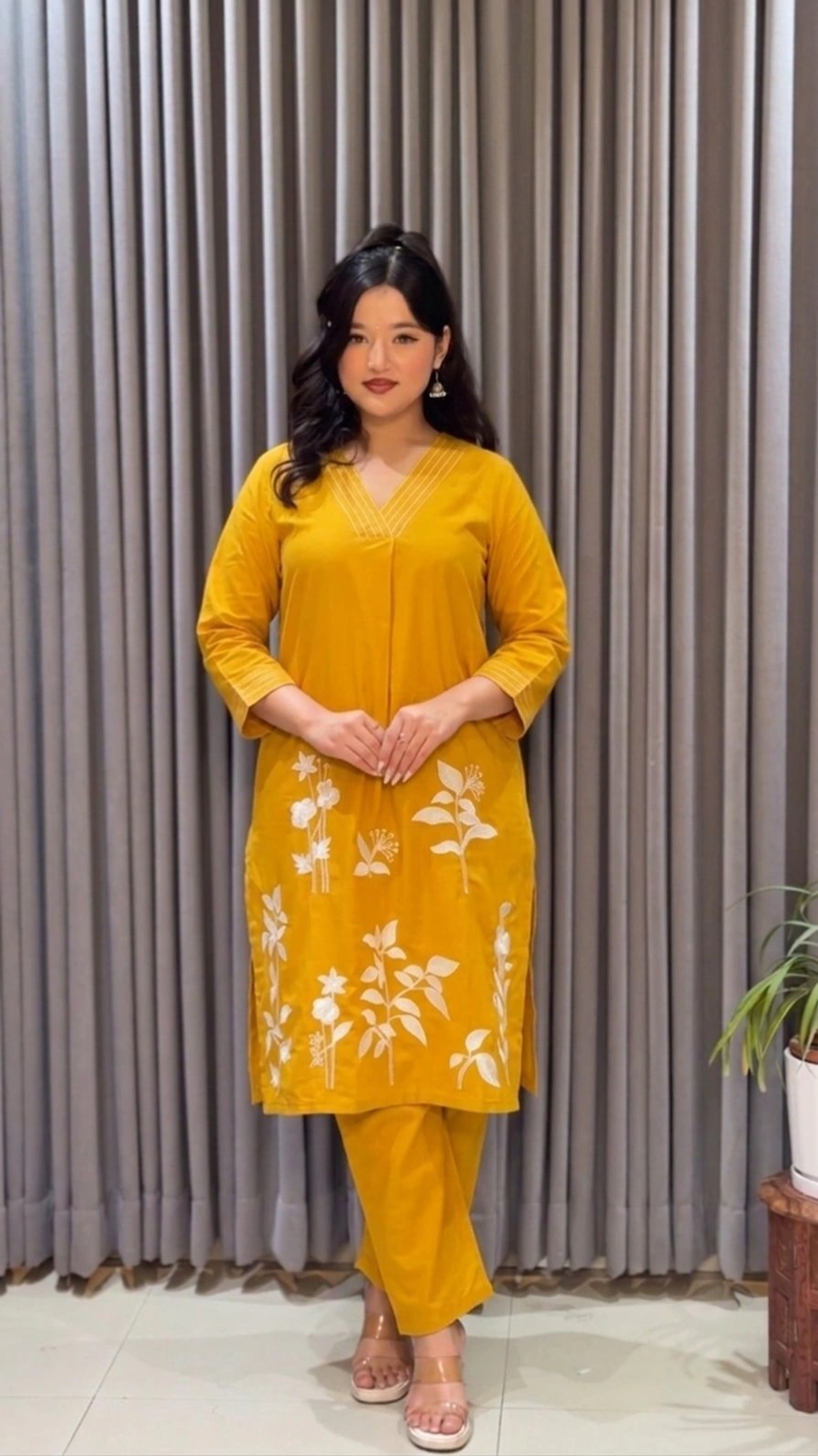 Made from soft and breathable cotton fabric, this co-ords set ensures all-day comfort while keeping your style on point. The straight-cut kurthi with delicate neckline detailing pairs perfectly with matching pants, making it ideal for office wear, casual outings, or everyday elegance.