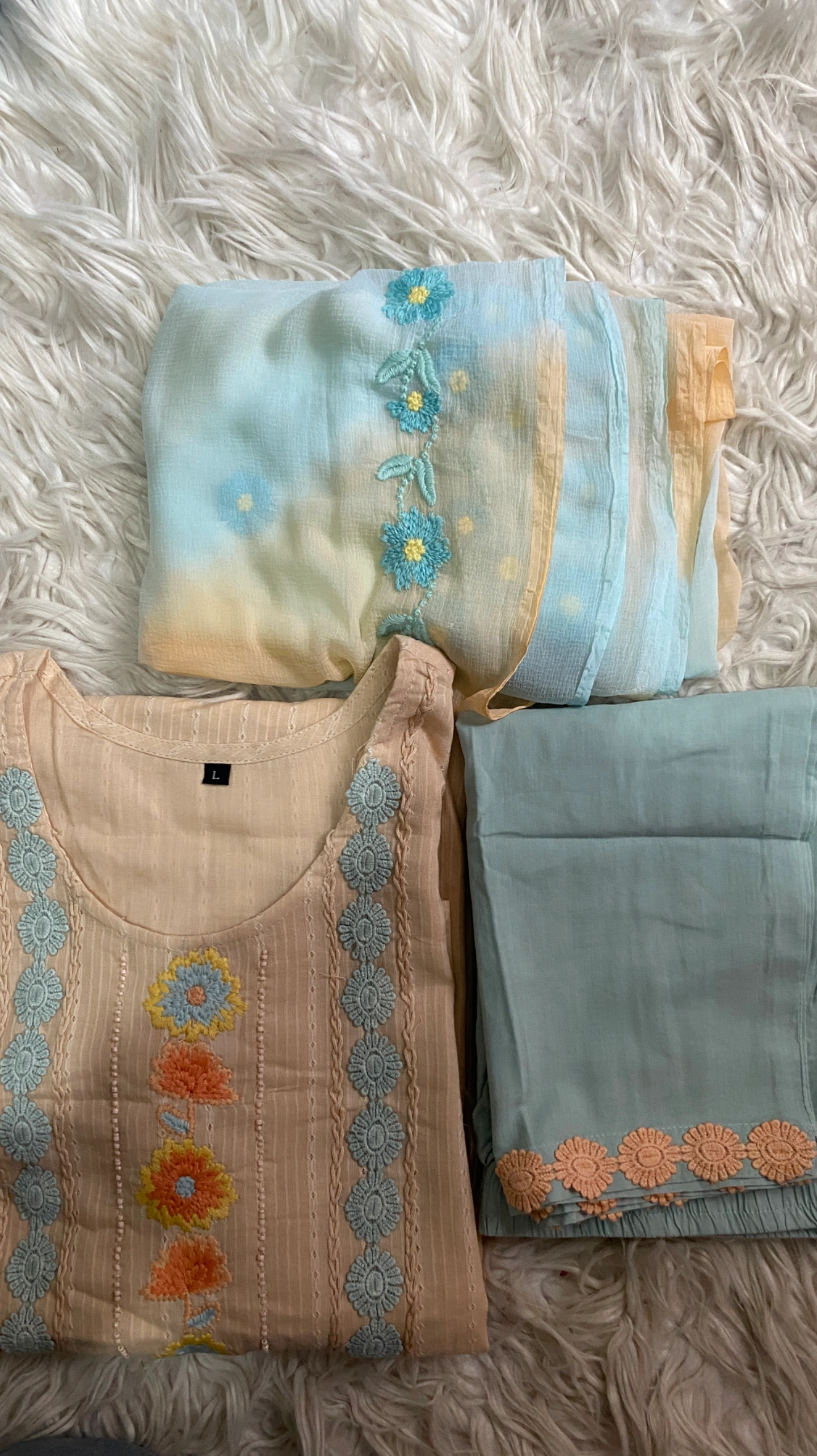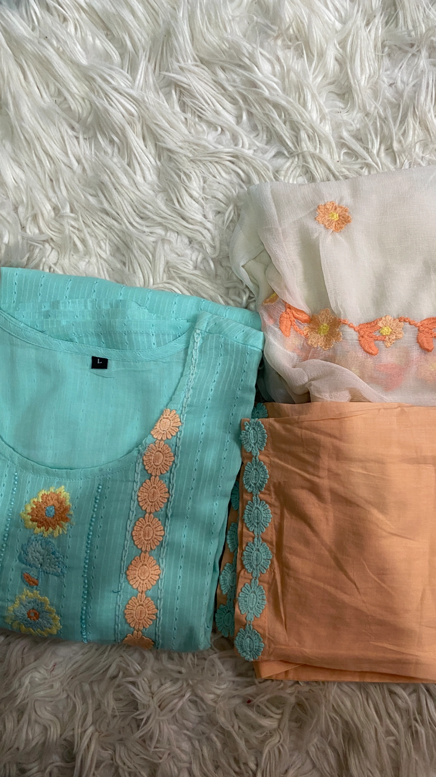 Description: This set features a beautifully crafted aqua blue kurthi made from soft and breathable mulmul cotton, paired with peach-colored pants for a gentle contrast. The dupatta, blending aqua blue and peach hues, complements the ensemble with a delicate mix of colors. Designed for comfort and elegance, this kurthi set is perfect for casual outings, festive occasions, or cultural events. The lightweight mulmul cotton ensures ease of wear while maintaining a graceful drape.